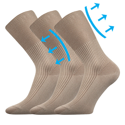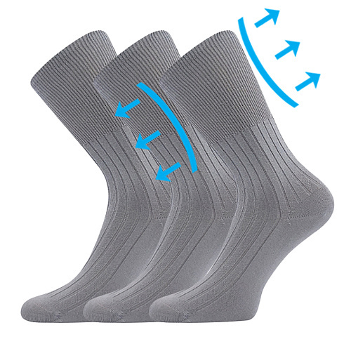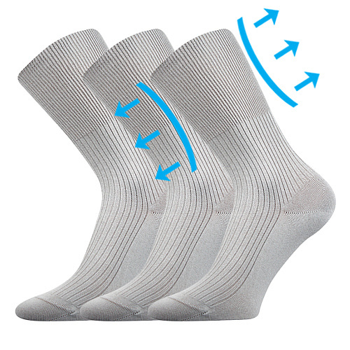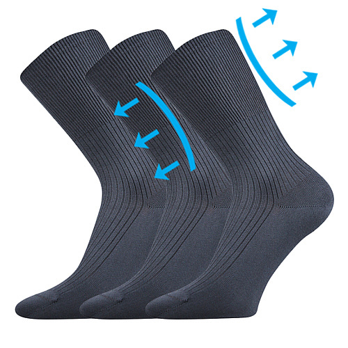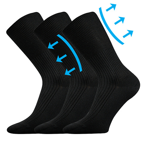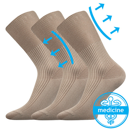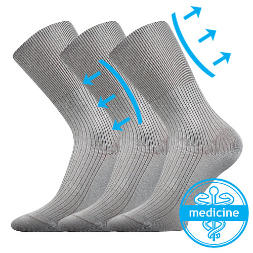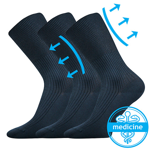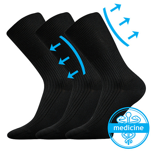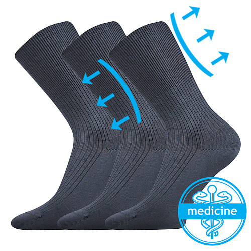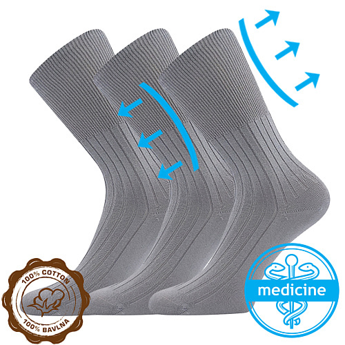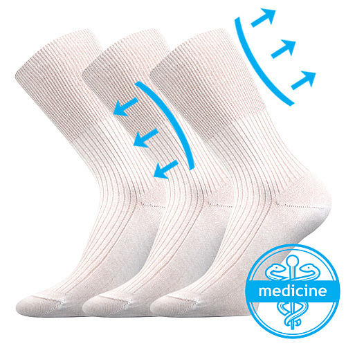 Medicine ponožky Lonka® ZDRAVAN ze 100% bavlny jsou ideální volbou pro oteklé nohy, vhodné i pro diabetiky. Vyšší ponožky z žebrovaného úpletu mají vyšší, speciální, extra volný a nestahující lem, zamezující otlakům a zaškrcení průtoku krve v končetinách. Ponožky ze 100% bavlny neobsahují žádnou příměs, jedná se tedy o čistě přírodní materiál, proto jsou vhodné např. pro ty, kteří trpí plísněmi, ekzémy, nadměrným pocením nebo nesnesou žádná umělá vlákna. Bez obav je můžete nosit po celý den i díky řetízkované špičce, která nikde netlačí. Dostupné i v nadměrné velikosti.