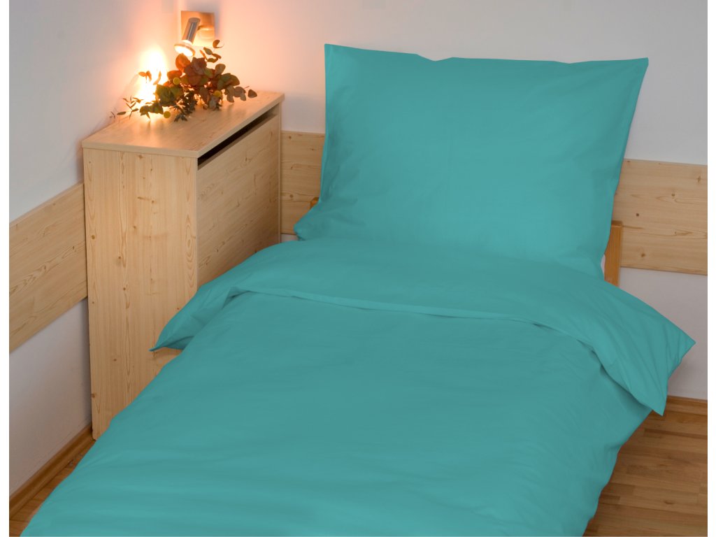 Ložní povlečení v tyrkysové barvě je vyrobeno z hladké jednobarevné 100% bavlněné tkaniny o plošné hmotnosti 130g/m2. Balení obsahuje 1ks povlaku na přikrývku 200x200cm a 2ks povlaků na polštář 70x90cm