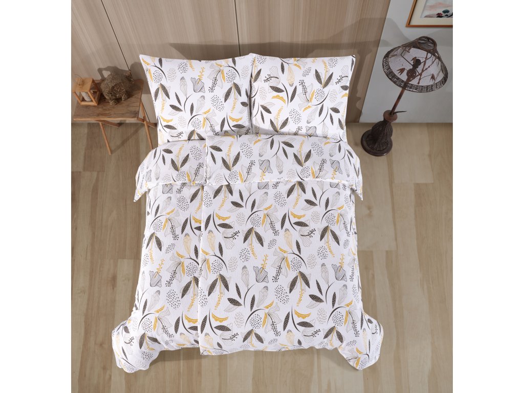 Dodejte své ložnici styl a eleganci s povlečením, které spojuje přírodní motivy s moderním designem. Na světlém podkladu se vyjímají jemné ilustrace listů a květů v odstínech hnědé, šedé a zlatavě žluté, které spolu vytvářejí harmonický a vkusný celek. Díky kombinaci neutrálních tónů s decentními žlutými akcenty působí povlečení nadčasově a snadno se sladí s jakýmkoliv interiérem. Vzor působí klidně a zároveň originálně – jako byste si do ložnice přinesli kousek přírody s moderním nádechem. Ideální volba pro ty, kteří hledají spojení přírodních motivů a elegantního designu.