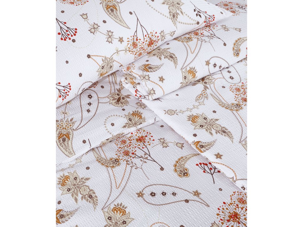 Vneste do své ložnice harmonii a klid s povlečením, které spojuje eleganci a přírodní motivy. Na světlém podkladu se jemně rozprostírají květy, lístky a stylizované ornamenty v teplých odstínech béžové, hnědé a terakotové. Vzor působí vzdušně, lehce a přesto originálně – ideální pro ty, kteří mají rádi jemnou decentnost s dotekem přírody. Neutrální barvy snadno sladíte s moderním i klasickým interiérem a dodají vaší ložnici útulnou atmosféru. Povlečení působí elegantně, ale zároveň pohodově, takže se v něm budete cítit vždy příjemně. Perfektní volba pro ty, kteří chtějí usínat v klidném a hřejivém prostředí.
