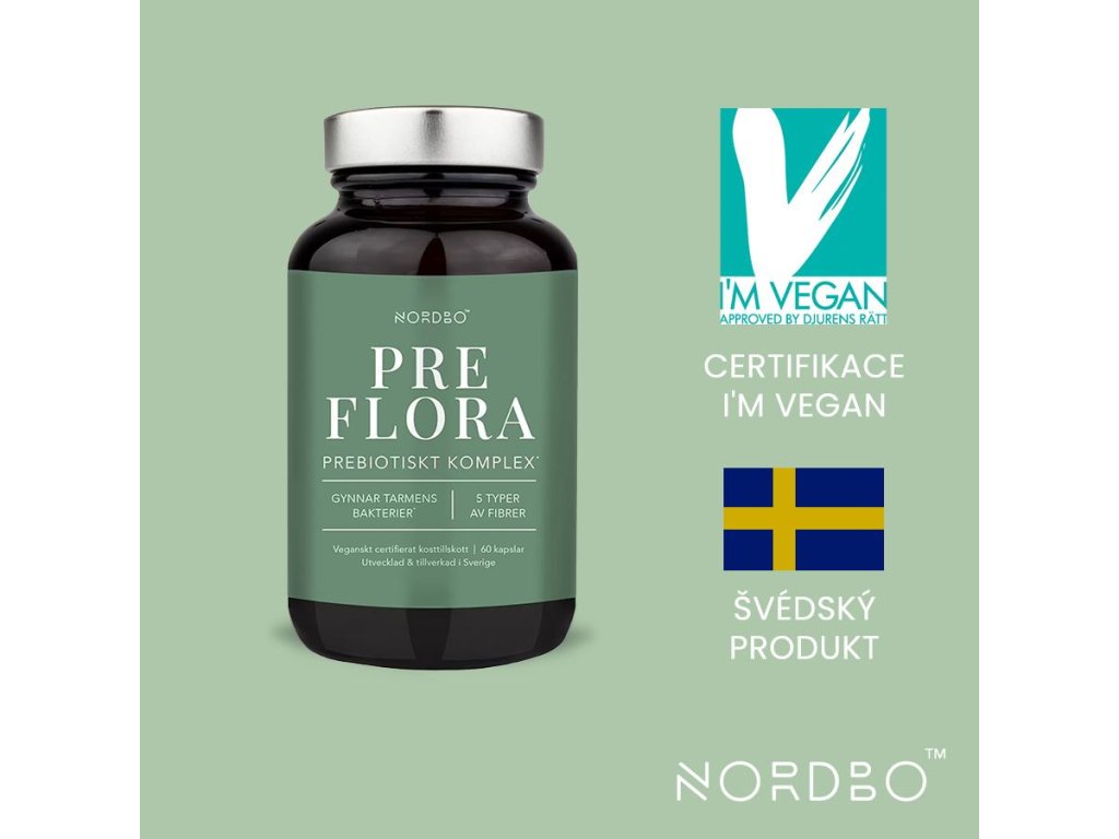Nordbo PreFlora obsahuje 5 druhů prebiotik - ResistaidTM = arabinogalaktan extrahovaný ze severoamerického modřínu. Arabinogalaktan je speciální přírodní polysacharid, který se skládá z látek zvaných karabinogalaktany a polyfenoly. Účinek složky ResistaidTM byl podpořen třemi klinickými studiemi. Dalšími složkami jsou inulin, rezistentní škrob, pektin a fruktooligosacharidy. Tyto látky fungují dvojím způsobem - v prvé řadě stimulují činnost žaludku a ve střevě tvoří výživu pro prospěšné biokultury. Kdy potřebujeme prebiotika? Jednoduše řečeno vždy, když potřebujeme probiotika, pro které tvoří výživu a základ. Proto je vhodné doplněk PreFlora užívat společně s produkty Lacti Total nebo Lacti Kvinna.