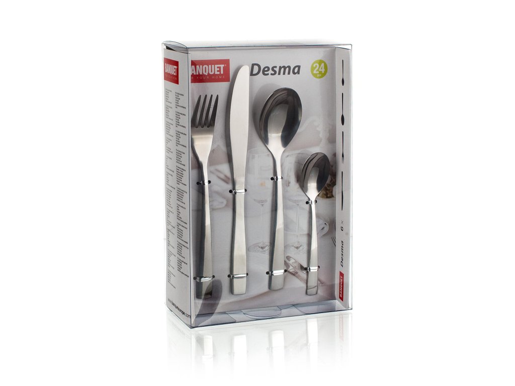 24dílná sada příborů DESMA. Sada obsahuje: 6x polévkovou lžíci, 6x vidličku, 6x jídelní nůž a 6x čajovou lžičku . Povrchová úprava lesk, síla nerezi: lžíce 1,8mm, vidlička 1,8mm, čajová lžička 1,5 mm, nůž 3 mm.