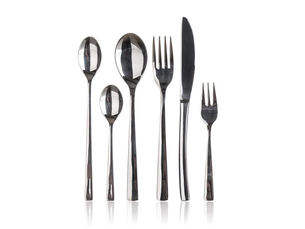Sada nerezových příborů NAMBO, 48 ks obsahuje 8x jídelní nůž, 8x jídelní vidličku, 8x jídelní lžíci, 8 x čajovou lžičku, 8x desertní vidličku, 8x latte lžičku. Materiál nerezová ocel 18/0.