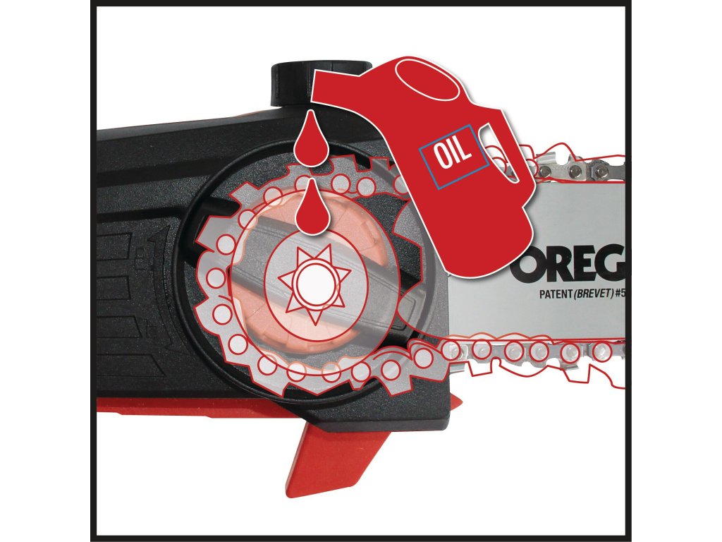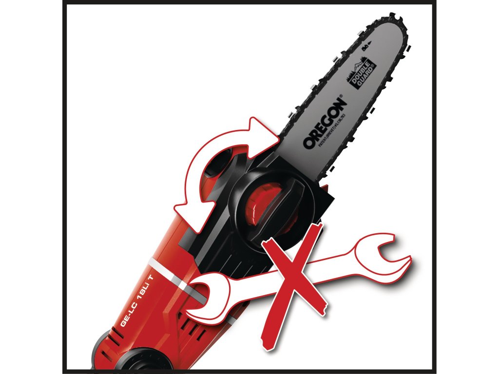 Nástavec prořezávací aku pily Einhell GE-HH 18/45 Li T. Rychlost řezání 3,76 m/s, nástavec je vybaven vysoce kvalitní lištou a řetězem OREGON. S nástavcem otočným o 90° lze snadno provádět vodorovné řezy. Výměna řetězu se provádí bez použití nářadí, napnutí řetězu lze rovněž nastavit bez nářadí. Robustní kovová převodovka zaručuje dlouhou životnost.Doplňkové parametry