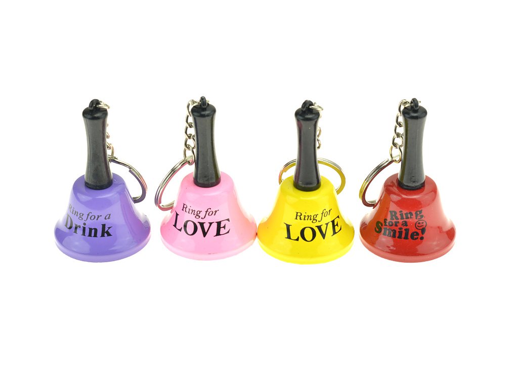 Zvoneček na klíče Kovový zvonek na klíče s plastovou rukojetí. Zvonky dodáváme ve více barvách a motivech náhodně dle skladové dostupnosti. Cena je uvedena za 1ks zvonečku