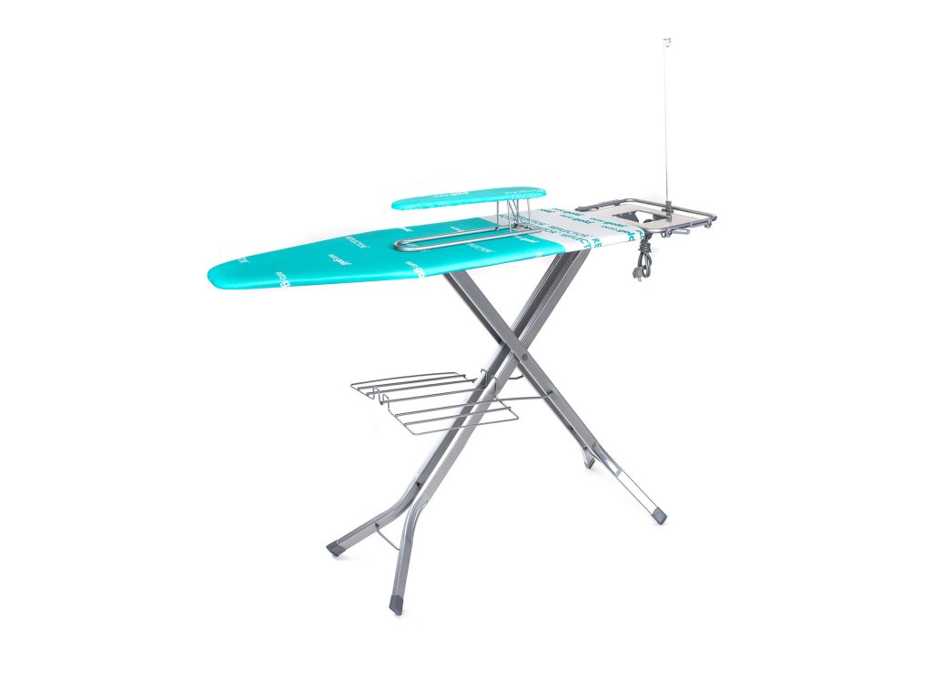Žehlící prkno je vybaveno integrovanou elektrickou zásuvkou, odkládacím prostorem pro parní žehličku a plochou pro vyžehlené prádlo.