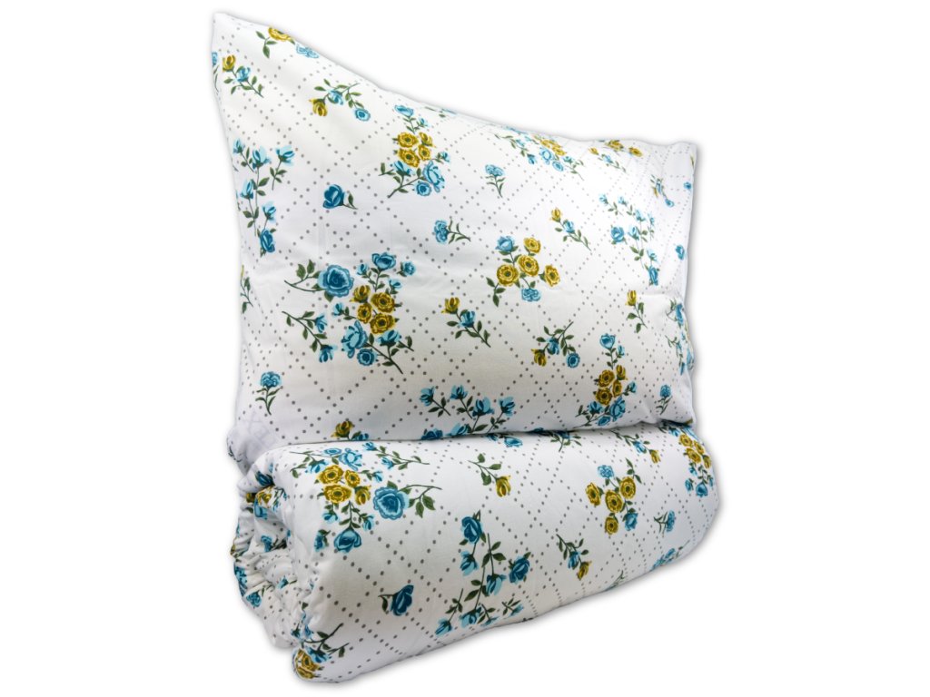 Toto povlečení zaujme svým sofistikovaným florálním vzorem, který kombinuje jemné motivy modrých a žlutých květin s pravidelnou mřížkou drobných teček. Elegantní uspořádání na světlém podkladu vytváří vyvážený a vkusný design, který do ložnice vnese klid, harmonii a nádech venkovské noblesy.