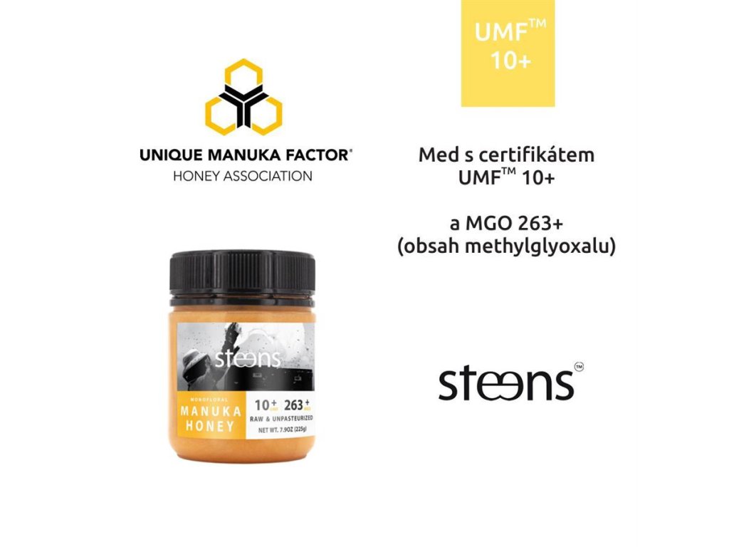 Steens Manuka Honey je raw nepasterizovaný pravý manukový med z Nového Zélandu. Pochází od včel opylujících Balmín metlatý, keř s bílorůžovými květy pocházející původně z Austrálie a Zélandu, kde mu původní domorodé maorské kmeny daly název Manuka. Med z květů Manuky má výjimečný výživový profil - obsahuje celé spektrum enzymů, aminokyselin, antioxidantů, vitamínů, minerálů a dalších látek s velmi zajímavými vlastnostmi. Manukový med je také známý jako chuťově výraznější, bohatší a plnější než jiné medy. Je to dáno velmi vysokou koncentrací účinných látek.