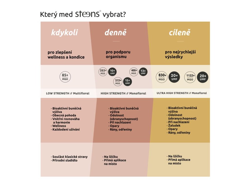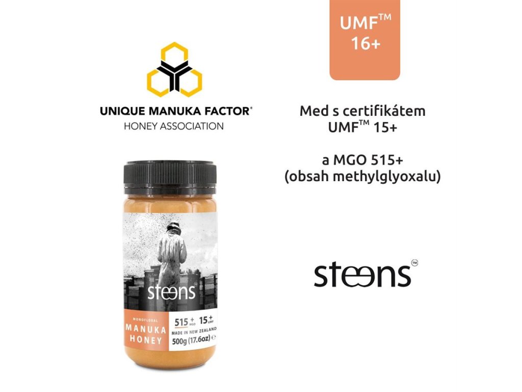 Steens Manuka Honey je raw nepasterizovaný pravý manukový med z Nového Zélandu. Pochází od včel opylujících Balmín metlatý, keř s bílorůžovými květy pocházející původně z Austrálie a Zélandu, kde mu původní domorodé maorské kmeny daly název Manuka. Med z květů Manuky má výjimečný výživový profil - obsahuje celé spektrum enzymů, aminokyselin, antioxidantů, vitamínů, minerálů a dalších látek s velmi zajímavými vlastnostmi. Manukový med je také známý jako chuťově výraznější, bohatší a plnější než jiné medy. Je to dáno velmi vysokou koncentrací účinných látek.