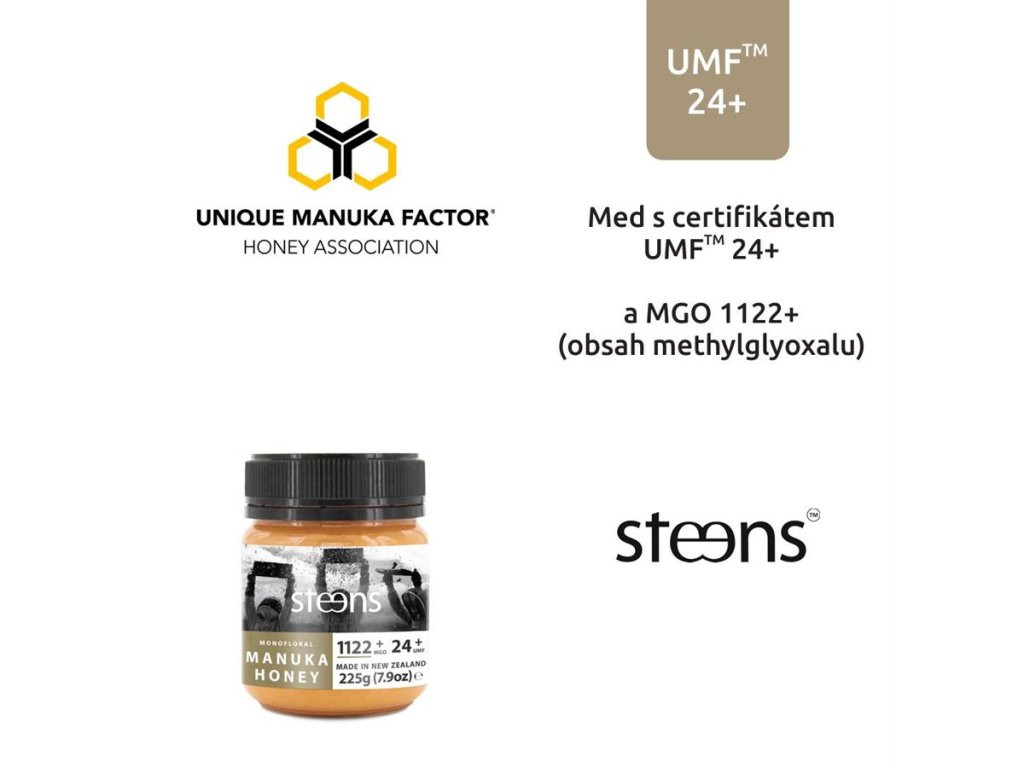 - UMF = Unique Manuka Factor = nejvyšší možný certifikát garantující obsah unikátních účinných látek
