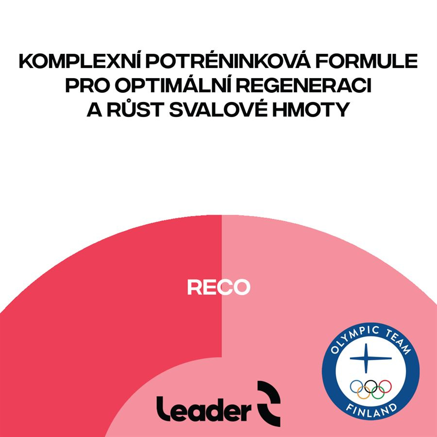 Leader Reco je navržený tak, aby pomohl tělu zotavit se po sportovním výkonu. Dlouhotrvající nebo náročný silový trénink tělo zatěžuje, proto potřebuje energii a stavební látky pro regeneraci. Reco obsahuje optimální množství kvalitního syrovátkového proteinu (původ Velká Británie) pro obnovu svalových vláken a dostatek kvalitních sacharidů pro obnovu svalového glykogenu. Reco dále obsahuje L-glutamin, L-leucin a kreatin, aminokyseliny podporující regeneraci a růst svalové hmoty.