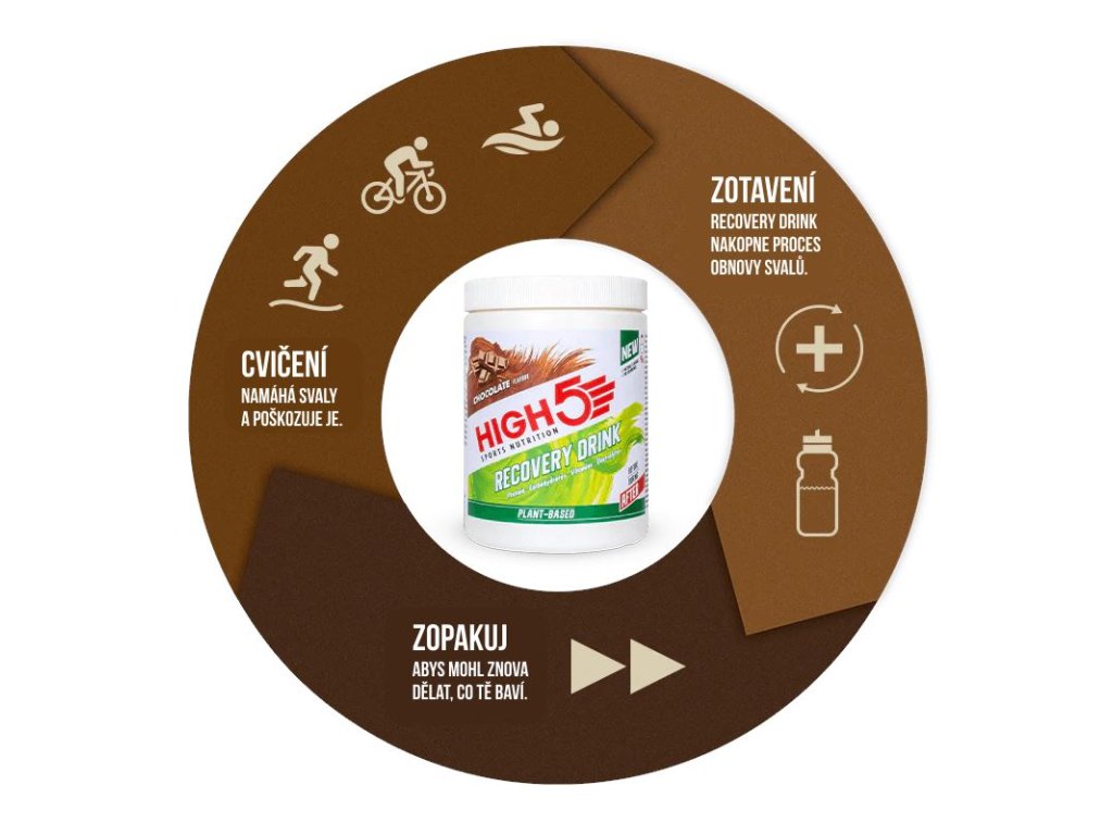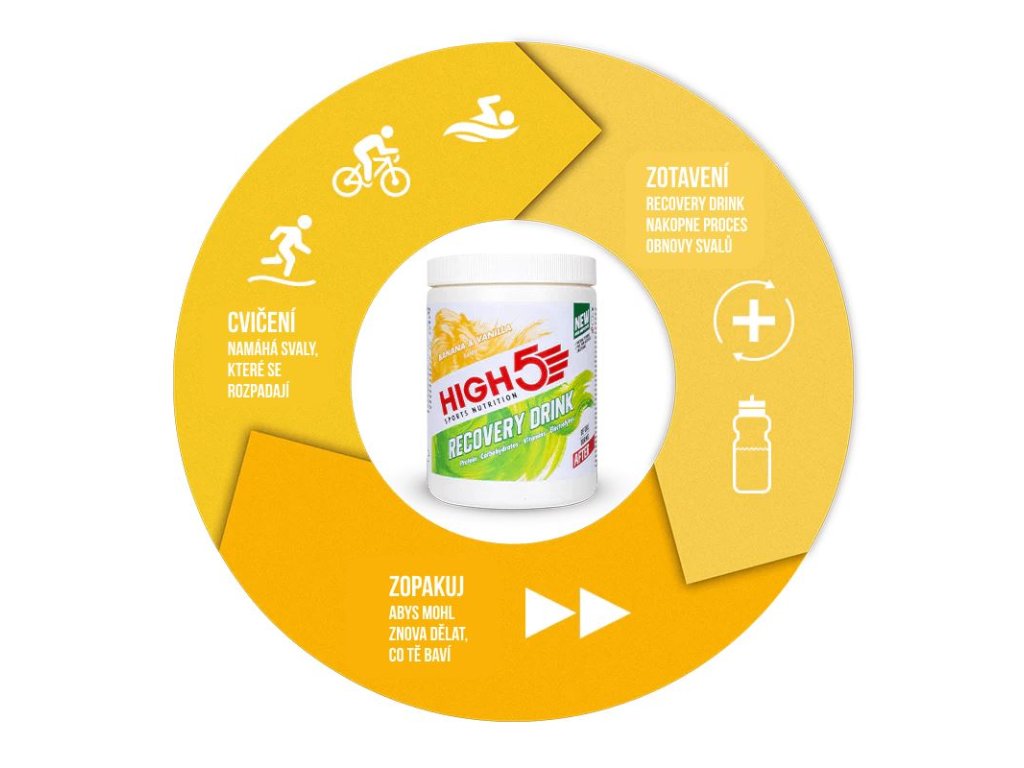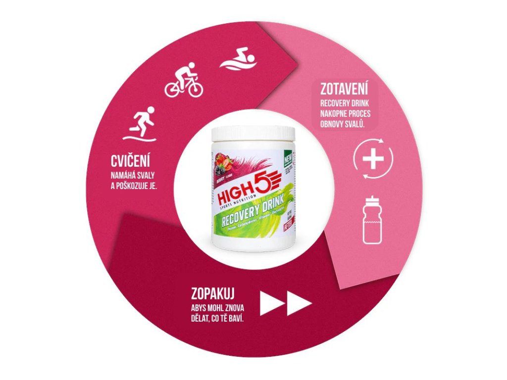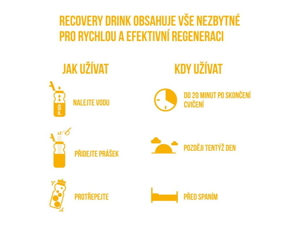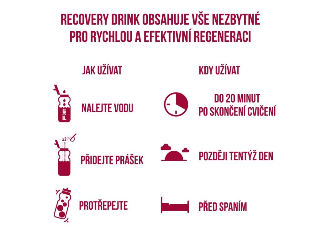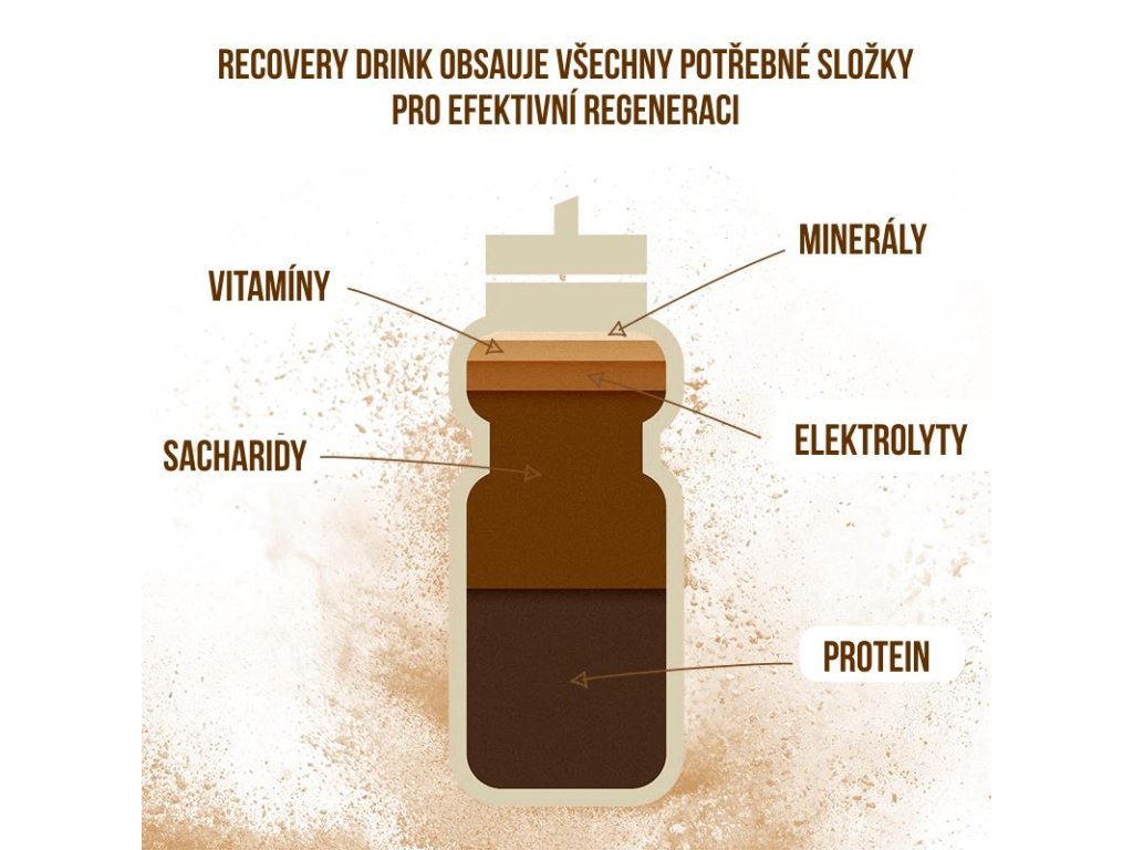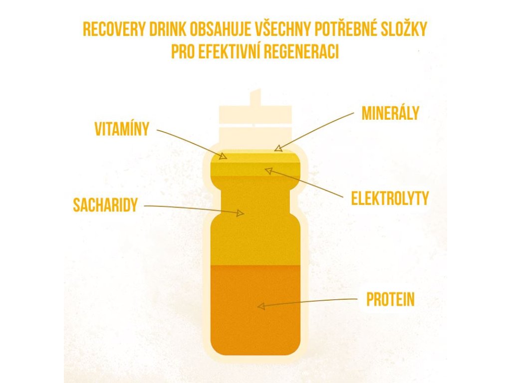 Recovery Drink je lahodný proteinový nápoj s vyváženou směsí proteinů, rychlých sacharidů a nově i klíčových elektrolytů, minerálů a vitamínů určený po podporu organismu po intenzivním vytrvalostním výkonu. Právě v tomto momentu přichází bolest a ztuhlost svalů, je vyčerpán svalový glykogen, což ústí v únavu a vyčerpání. Unikátní forma syrovátkového WPI proteinu (izolát nejvyšší kvality) a sacharidů obsažená v Recovery Drinku je vybrána tak, aby zajistila co nejrychlejší regeneraci po výkonu.