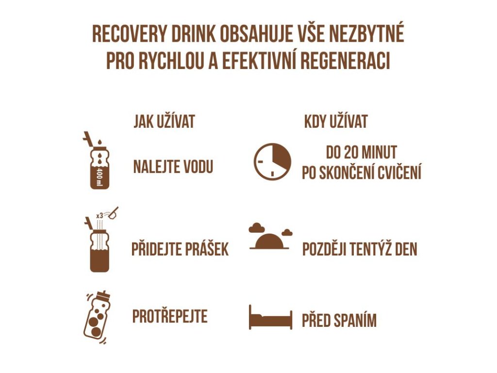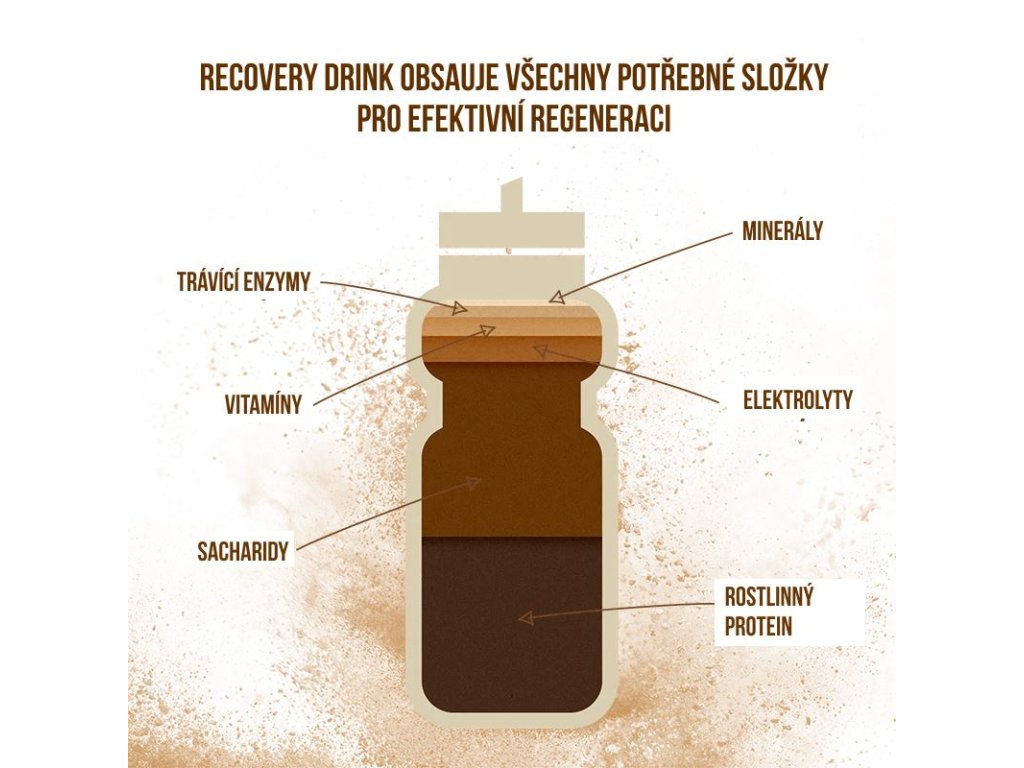 Recovery Drink je lahodný veganský proteinový nápoj s vyváženou směsí proteinů, rychlých sacharidů a nově i trávících enzymů, klíčových elektrolytů, minerálů a vitamínů určený po podporu organismu po intenzivním vytrvalostním výkonu. Právě v tomto momentu přichází bolest a ztuhlost svalů, je vyčerpán svalový glykogen, což ústí v únavu a vyčerpání. Unikátní forma tří rostlinných proteinů a sacharidů obsažená v Recovery Drinku je vybrána tak, aby zajistila co nejrychlejší regeneraci po výkonu.