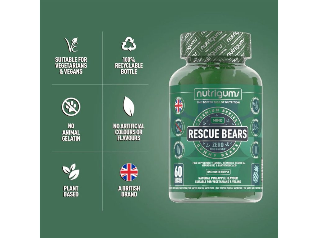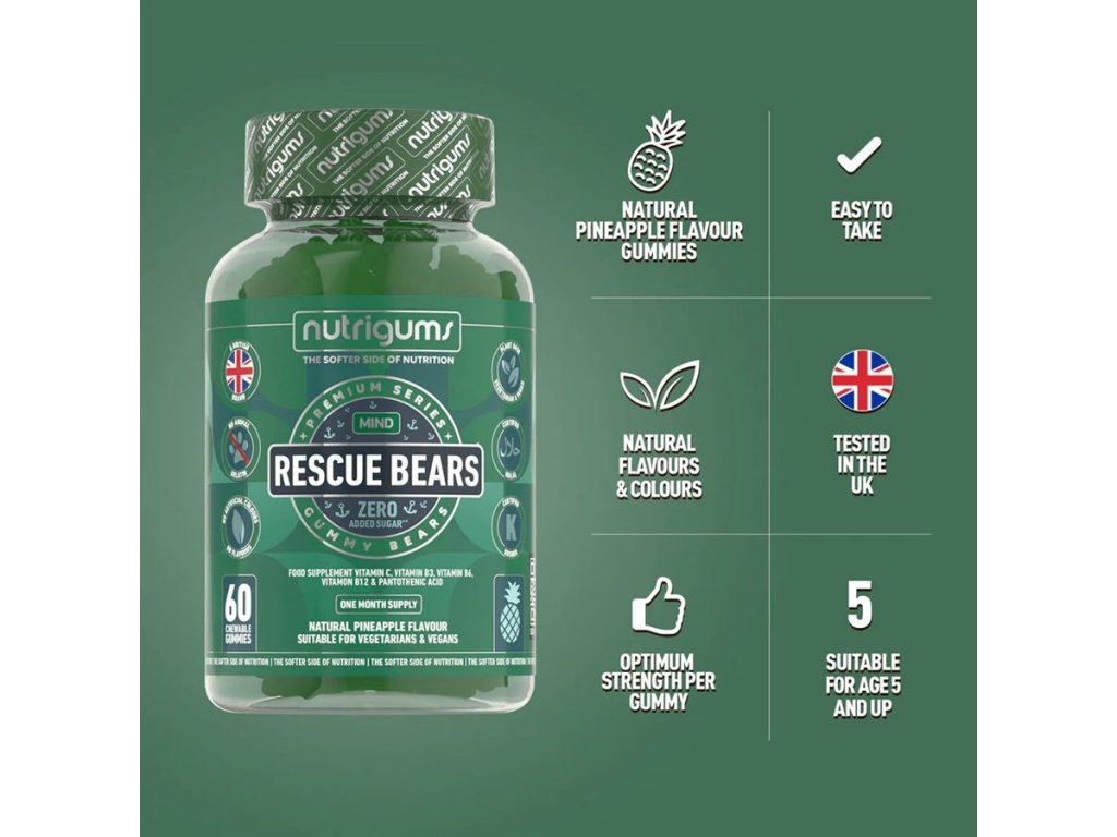 Vitamínová želé nemusí být plná umělých sladidel a barviv! Jde si pochutnat i bez syntetických látek. Želé Nutrigums® Rescue Bears mají lahodnou přírodní ananasovou příchuť a lehce se konzumují. Tělu dodává všechny benefity extraktu z meduňky, heřmánku a zeleného čaje, které mají vlastnosti související se stresem, úzkostí a nervozitou (činností nervové soustavy). Jejich účinek doplňují glycin a taurin, vitamíny skupiny B, jejichž vlastnosti souvisí také s nervovou soustavou, jód a zinek, jejichž vlastnosti souvisí s neurotransmiterem GABA.