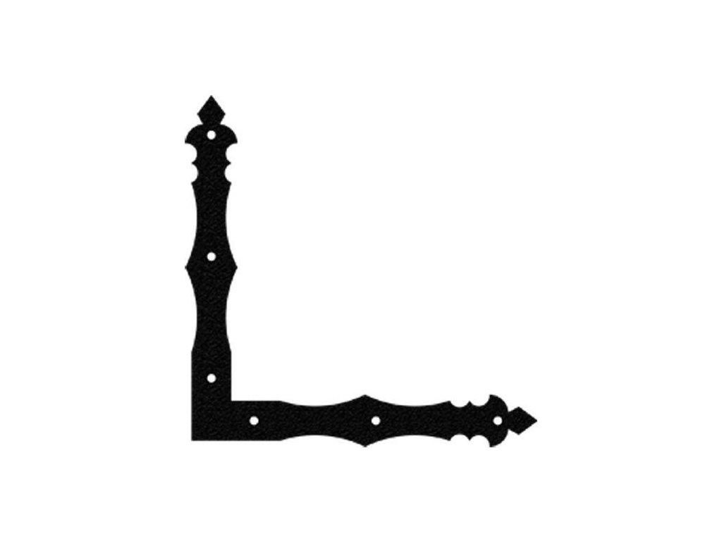 Ozdobný ocelový rohovník v černé barvě. Ocelový rohovník pro pohledové spojení či zajištění dveřních křídel, okenic, vrat a podobně.