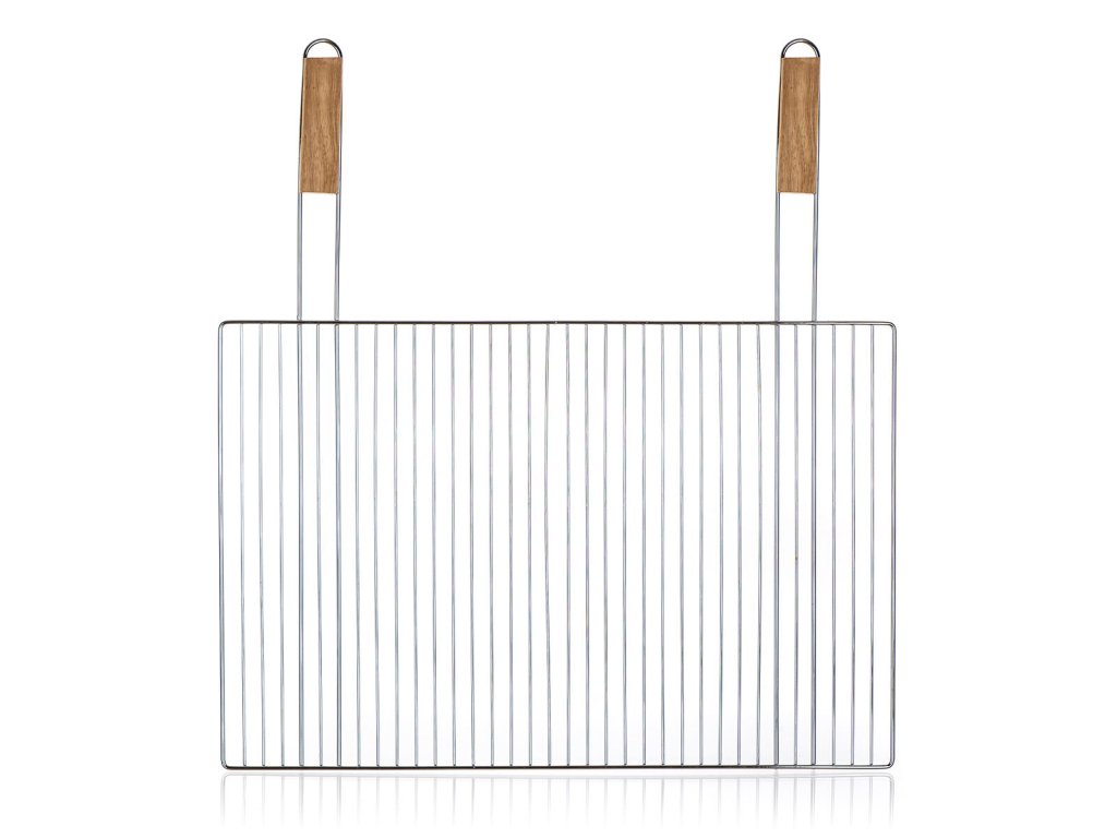 Hranatý grilovací rošt BBQ s dřevěnými rukojeťmi využijete pro snadné grilování masa, zeleniny apod.