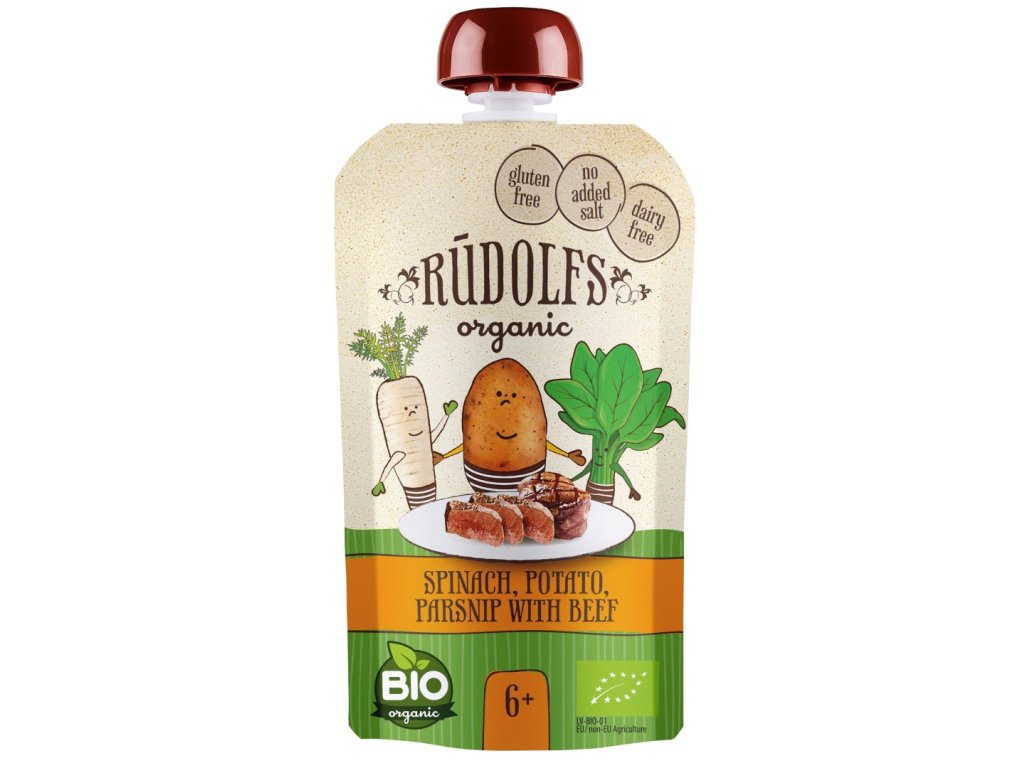 Složení:Brambora * 40%, voda, pastinák* 10%, cibule*, hovězí maso * 8%, zelený hrášek*, špenát*3%, koření*. *- ekologické zemědělství.