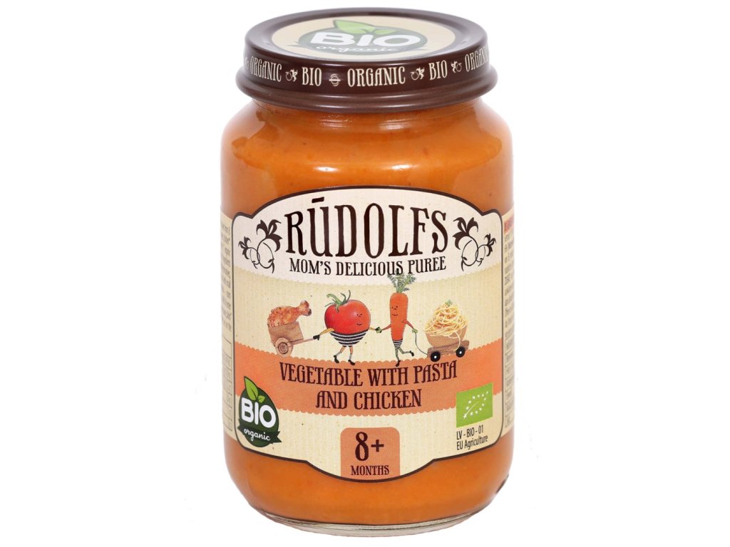 Zeleninový příkrm s těstovinami a kuřecím masem pro zvláštní výživu kojenců a malých dětí od ukončeného 8. měsíce. Bez přidaných konzervantů a soli.