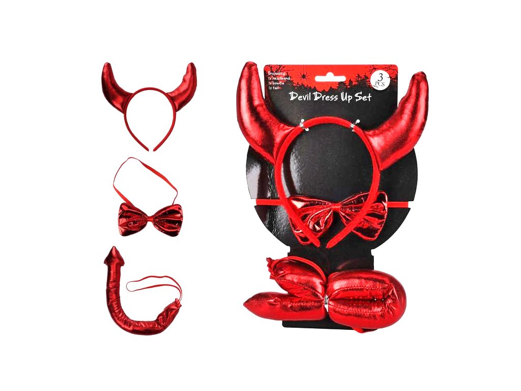 Vlastnosti: Ideální na halloweenské oslavy i další tematické akce. Obsahuje rohy, ocas a mašli v červené barvě. Snadno se obléká a je opakovaně použitelný. Vhodný pro děti i dospělé, univerzální velikost. Lze kombinovat s různými outfity pro vlastní stylizaci. Parametry: V balení: rohy na čelence, ocas na gumičce, mašle na gumičce. Doporučený věk: od 3 let. Barva: červená. Materiál: plast. Hmotnost netto: 0,063 kg, brutto: 0,075 kg. Rozměry balení: 19 x 3 x 28 cm (š x h x v). S tímto kostýmem budete vždy styloví a připraveni na každou čertovinu!