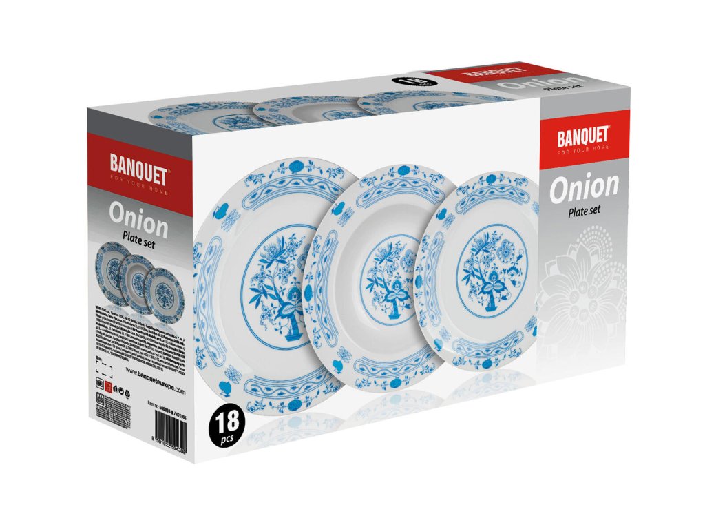 18dílná talířová sada ONION s dekorem cibulák, je vyrobena z porcelánu.