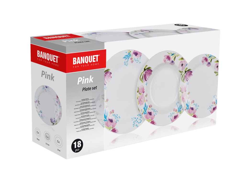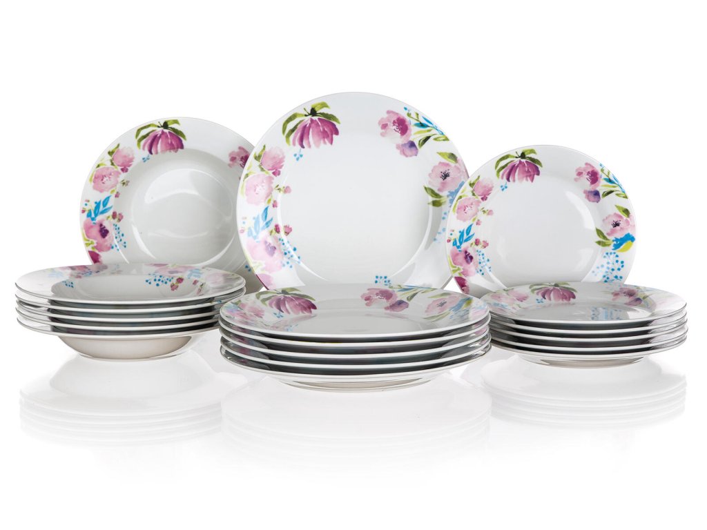 18dílná talířová sada PINK FLOWERS je vyrobena z porcelánu.