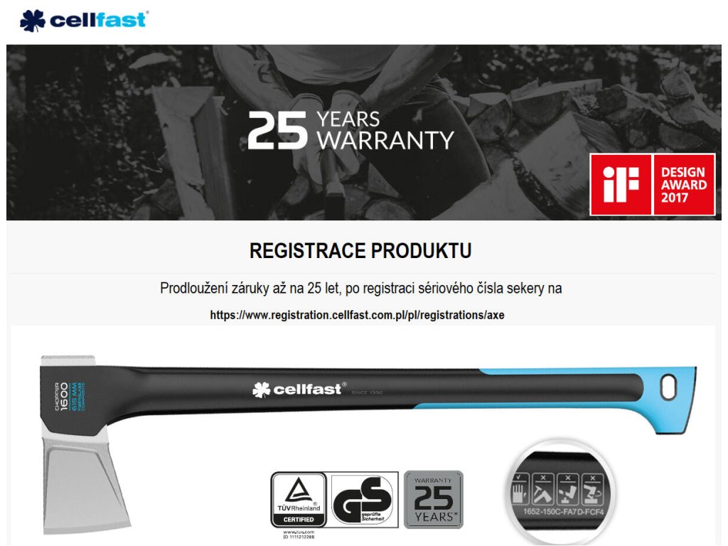 V případě seker Cellfast je možné si záruku prodloužit a to až na dobu 25 let, na základě registrace na stránkách: https://www.registration.cellfast.com.pl/pl/registrations/axe