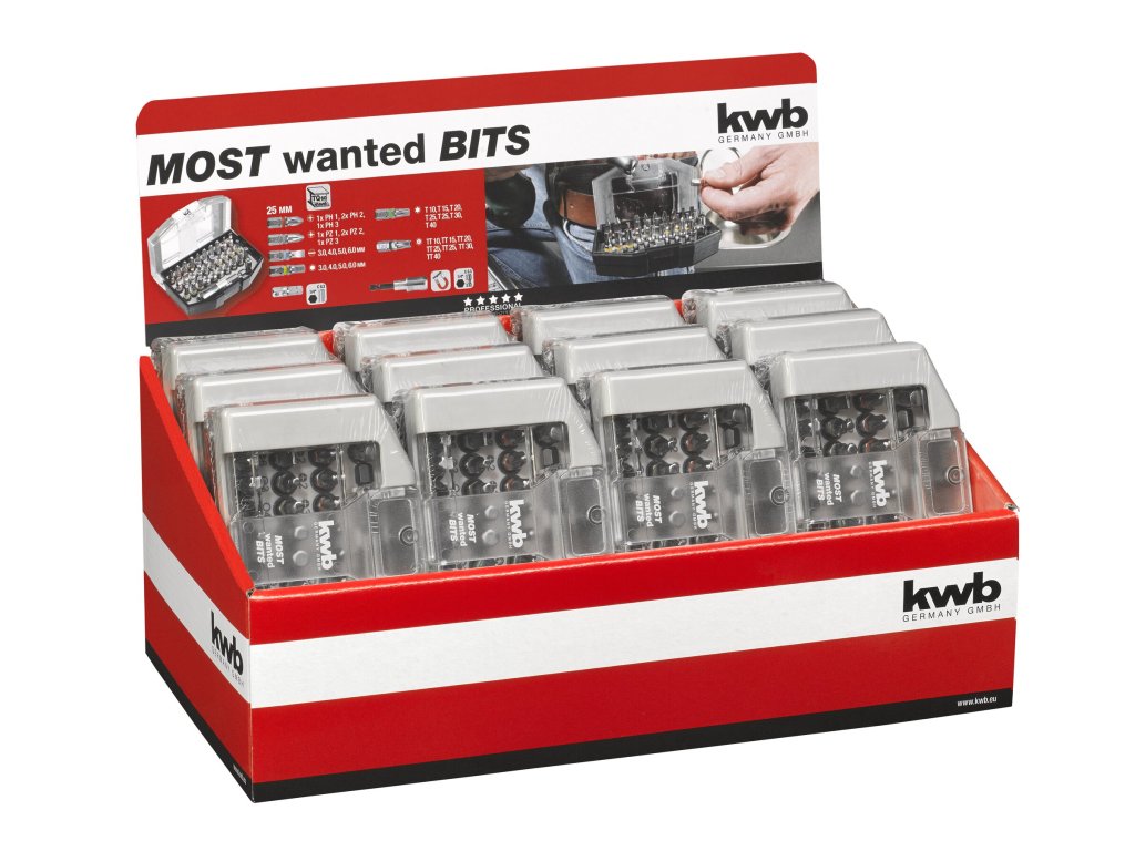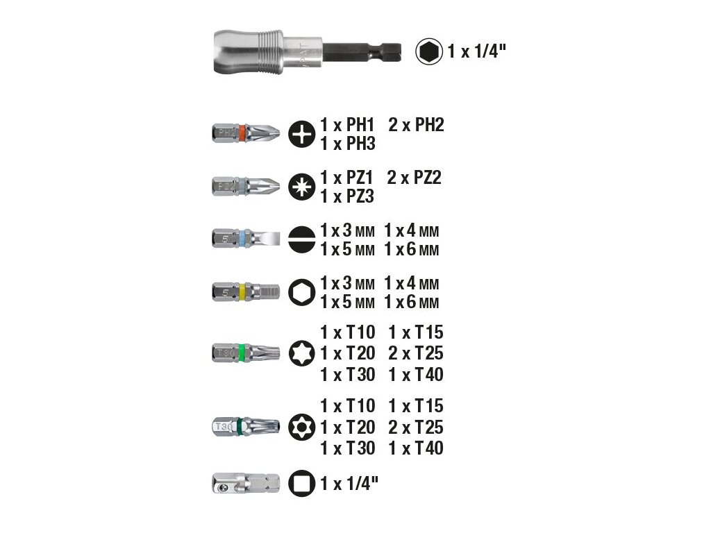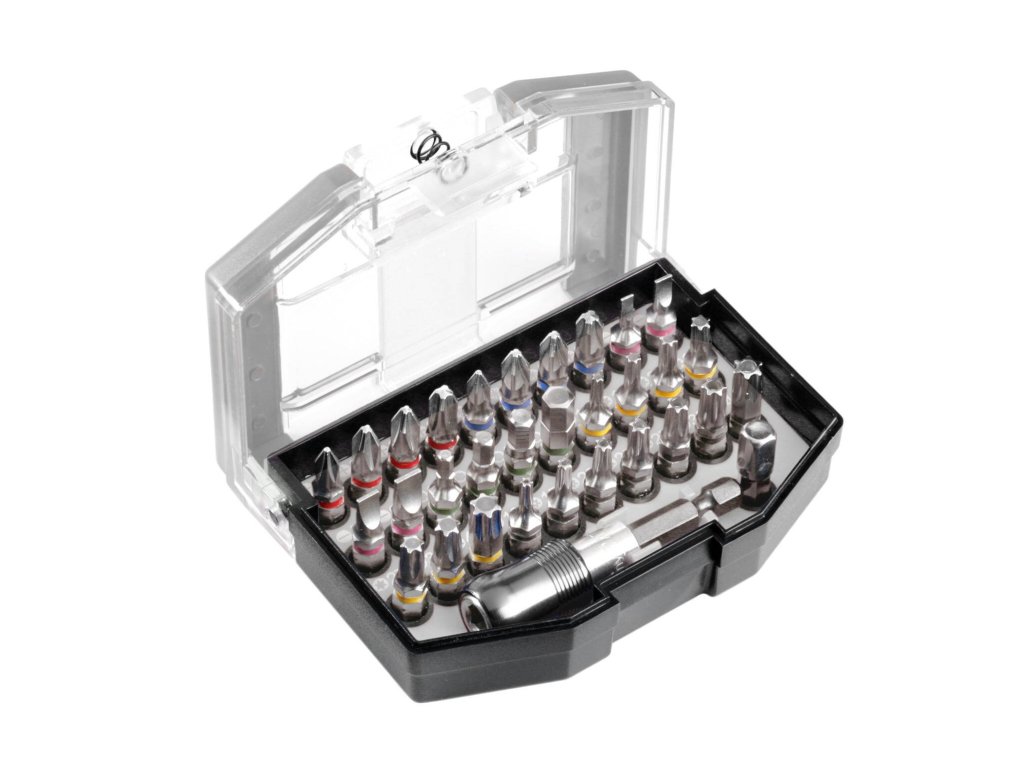 Bit Box STANDARD 32-piece, 1/4“ hexagon drive bits to ISO 1173, C 61.3 industrial quality, With colour coded rings to distinguish the screw head types, Quick release bit holder with 1/4“ hexagon fitting to ISO 1173, C 6.3, box with handy belt clip, Supplied 12 sets in counter displayDoplňkové parametry
