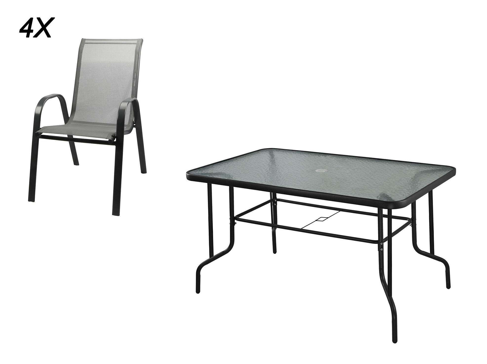 Set zahradní ocel / textilén / sklo, stůl + 4 židle, ČER.