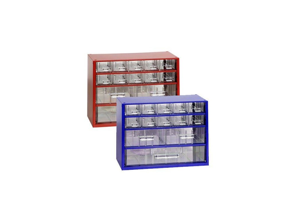 Kovová ukládací skříňka s plastovými zásuvkami 3 velikostí je vhodná pro přehledné skladování drobných předmětů a součástek.