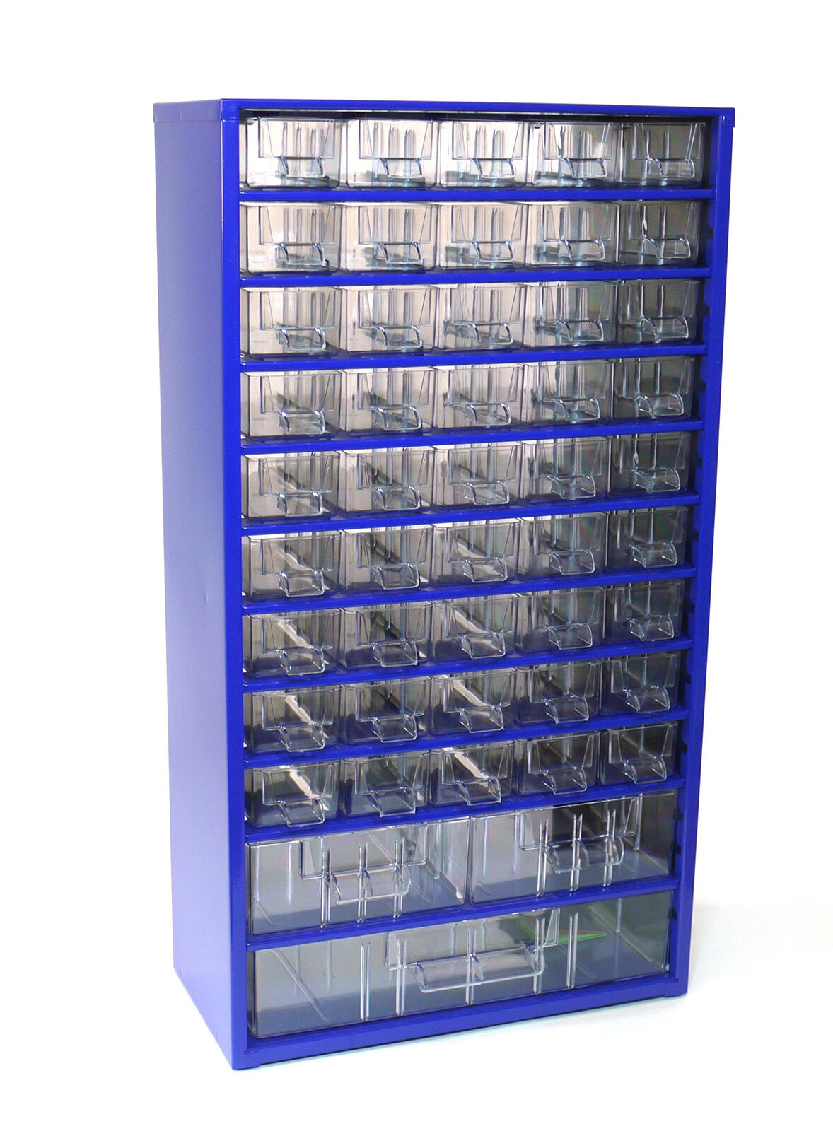 Skříňka 3 velikosti, 45 malých, 2 střední, 1 velká zásuvka, 30,5 x 55 x 15,5 cm, kov. MO.