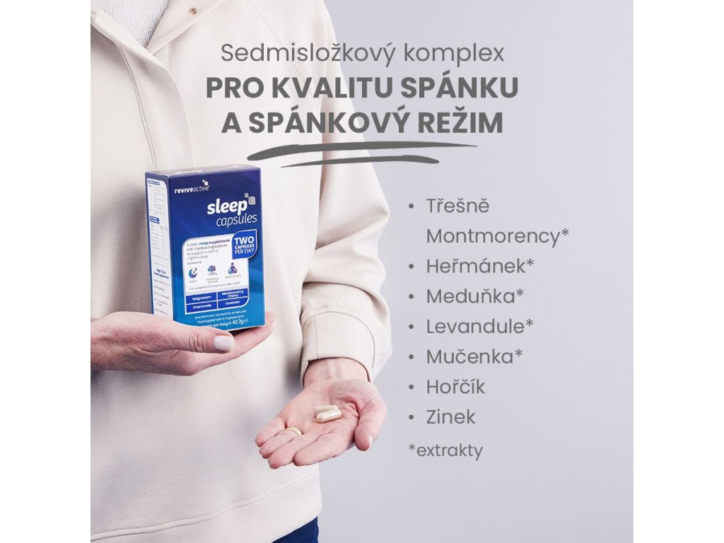 Sleep je ve své kategorii ultimátní doplněk stravy, který má okamžitý i dlouhodobý účinek. Produkt je sestavený speciálně pro jedince, kteří mají problémy se spánkem v krátkodobém i dlouhodobém horizontu. Podporuje klidný spánek, spánkový rytmus i nervovou soustavu. Třešeň Montmorency je přirozeným zdrojem melatoninu, který má vlastnosti související s cirkadiánním rytmem. Všech sedm obsažených složek pak má podobné účinky související s nervovou soustavou. Na rozdíl od konvenčních léků na těchto složkách nevzniká návyk. To vše bez obsahu nežádoucích a balastních aditiv v každé kapsli!