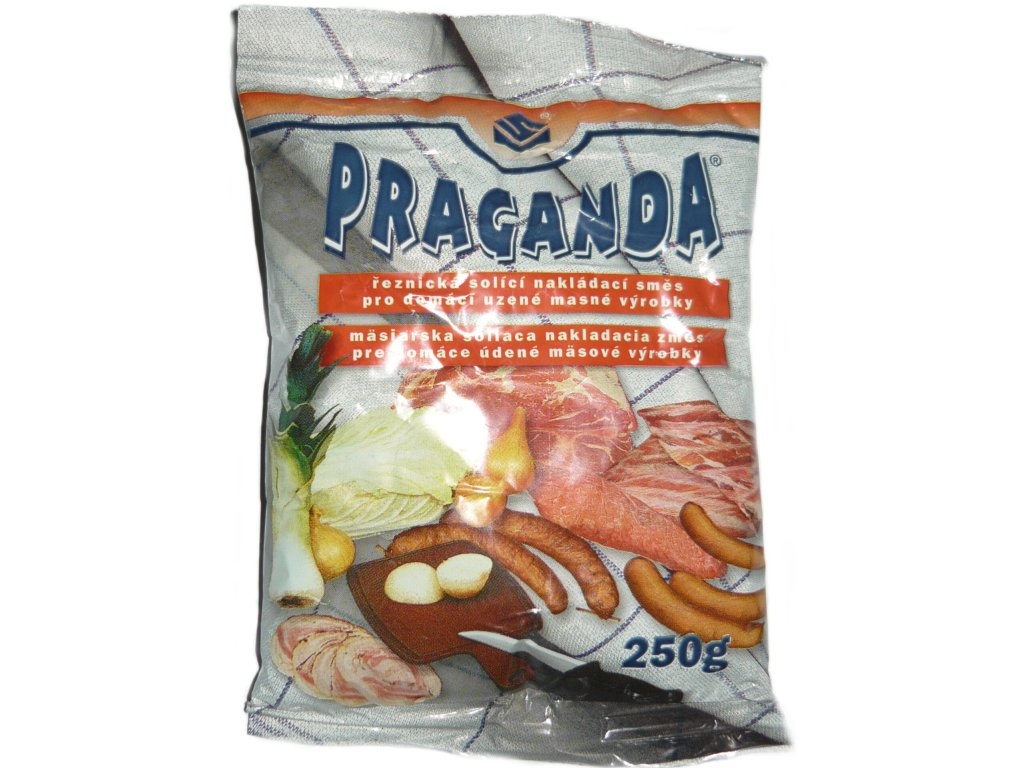 Praganda - řeznická solicí a nakládací směs pro domácí uzené masné výrobky je homogenní směs, obsahující kamennou sůl, dusitan sodný a cukry, určená pro malospotřebitelské použití.