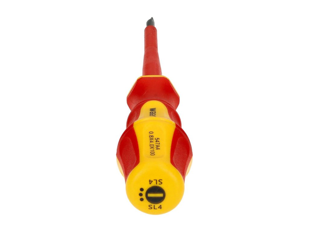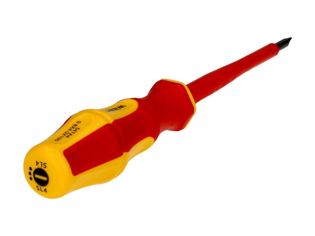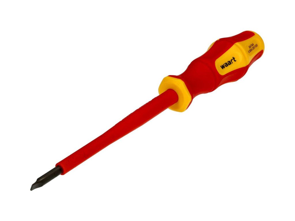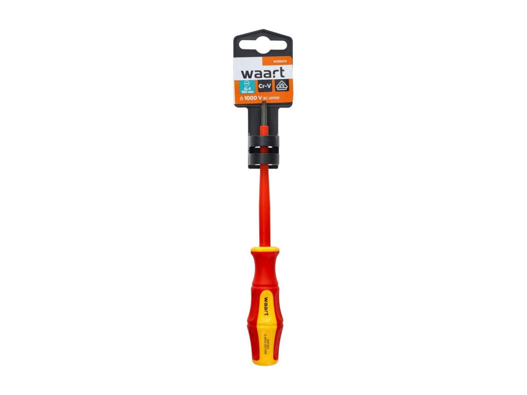 Šroubovák je vybaven izolovanou rukojetí z materiálu, který zajišťuje elektrickou izolaci a chrání uživatele před úrazem elektrickým proudem, přičemž umožňuje bezpečné uchopení.