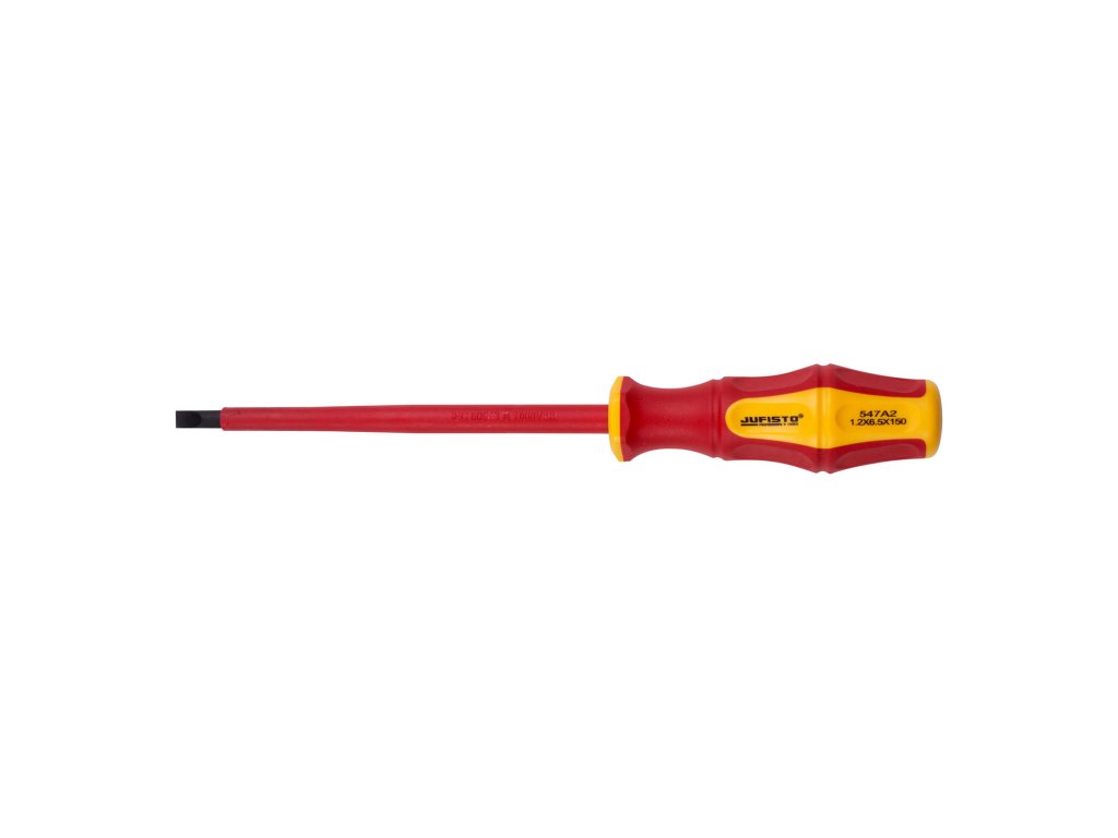 Šroubovák je vybaven izolovanou rukojetí z materiálu, který zajišťuje elektrickou izolaci a chrání uživatele před úrazem elektrickým proudem, přičemž umožňuje bezpečné uchopení.