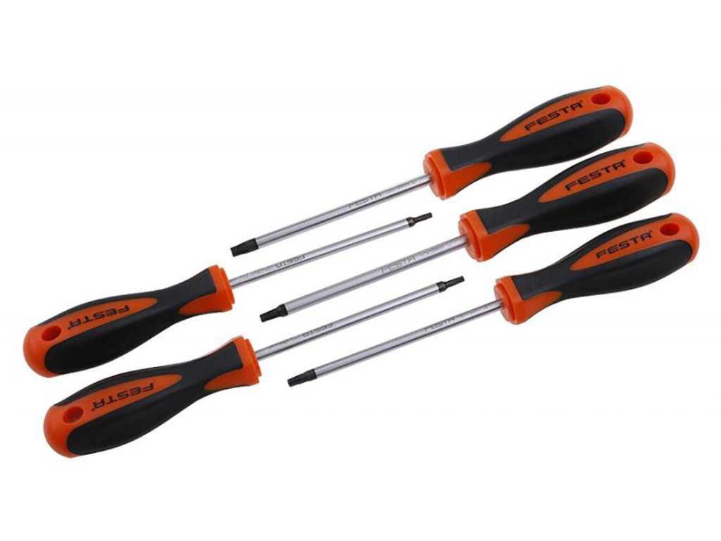 Sada šroubováků FESTA má kovový dřík vyroben z velmi kvalitní molybdenové oceli S2, kalený hrot je magnetický, povrchově chráněný tvrdochromem, kombinace polypropylenu a pryže na ergonomicky tvarované rukojeti zaručuje výborné antiskluzové vlastnosti a dobrou odolnost vůči mazadlům a chemikáliím.