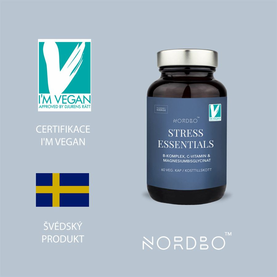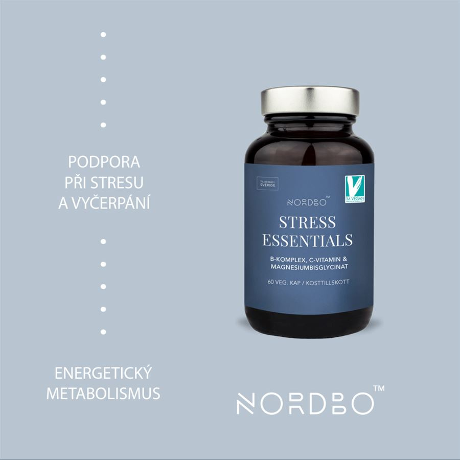 Nordbo Stress Essentials obsahuje celkem 12 synergně působících složek - vitamíny B1, B2, B3, B5, B6, B7, B9, B12, cholin, inositol, kysele neutrální vitamín C a hořčík (chelátová vazba). Vitamíny skupiny B mají vlastnosti související s energetickým metabolismem. Jsou nezbytné při velké psychické i fyzické zátěži. Psychickou zátěží je typicky stres z náročného povolání, obtížná životní situace nebo různé druhy emočního neklidu. V takovém případě organismus potřebuje dodávat ty správné látky, aby udržel svoje fungování. S energetickým metabolismem souvisí také vlastnosti hořčíku, zatímco cholin a inositol mají účinky související s fungováním nervových přenosů v mozku. Vitamín C funguje jako antioxidant a zároveň pomáhá vstřebání ostatních látek.