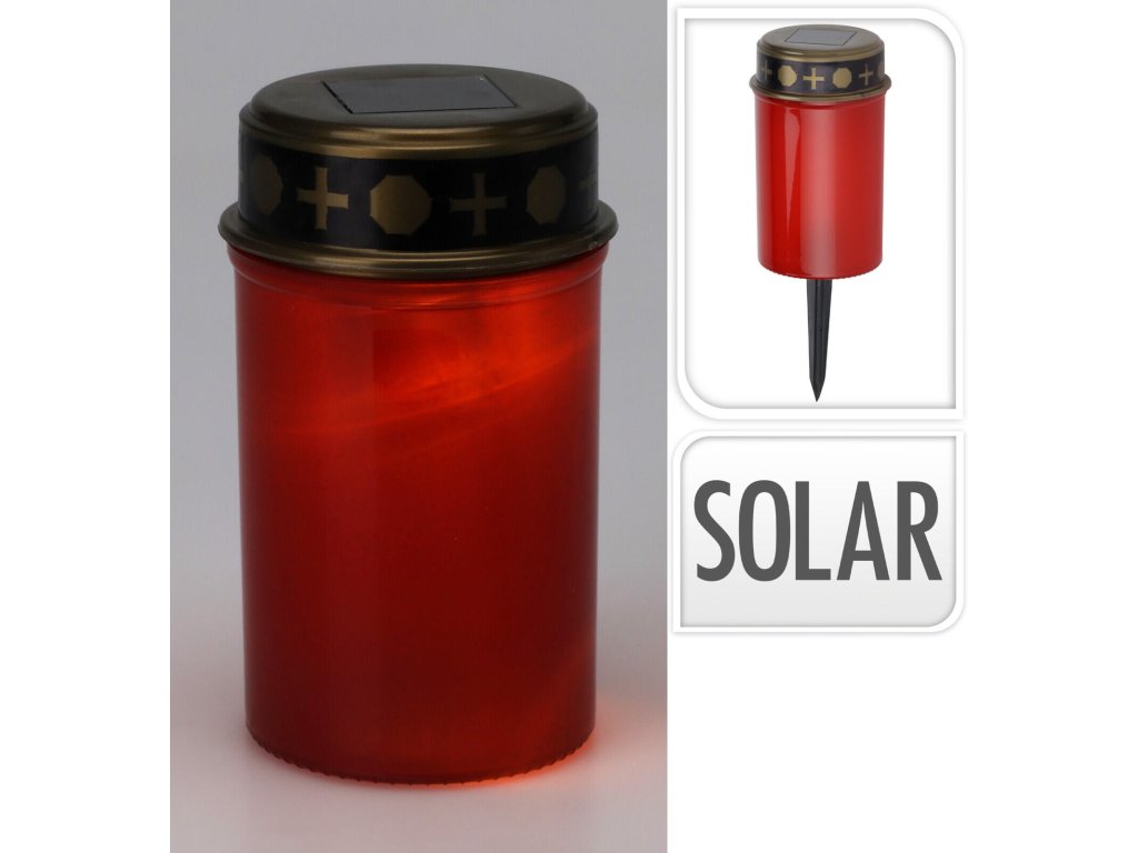 Hřbitovní LED svíčka válcovitého tvaru se solárním panelem, které umožňuje nabíjení skrze sluneční svit.