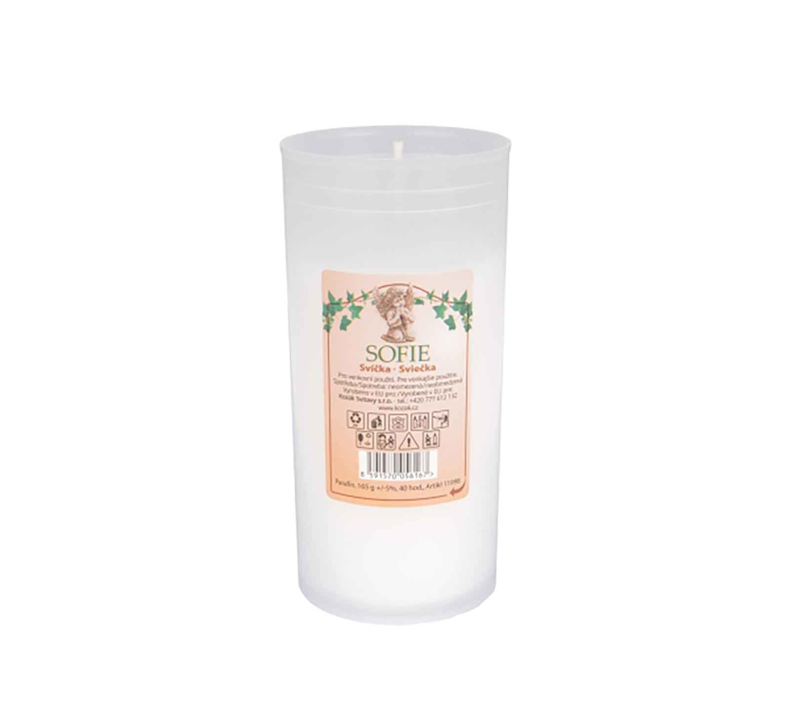 Parafínová hřbitovní svíčka, s náplní 150 g lisovaného parafínu, je vyrobená z kvalitního parafínu a díky použití speciálního knotu zajišťuje dokonalé vyhoření náplně bez zakouření skla.