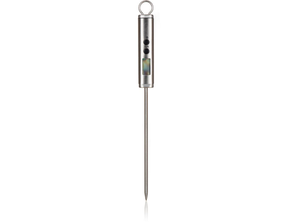 Kuchyňský digitální teploměr má dlouhou nerezovou sondu s čidlem, která se dá jednoduše zasunout do jakéhokoliv jídla a zjistit tak aktuální teplotu.