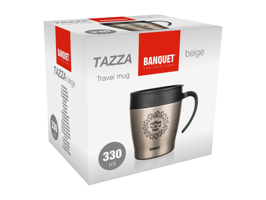 Dvoustěnný cestovní termohrnek TAZZA v béžové metalické barvě, je vhodný na teplé i studené nápoje.