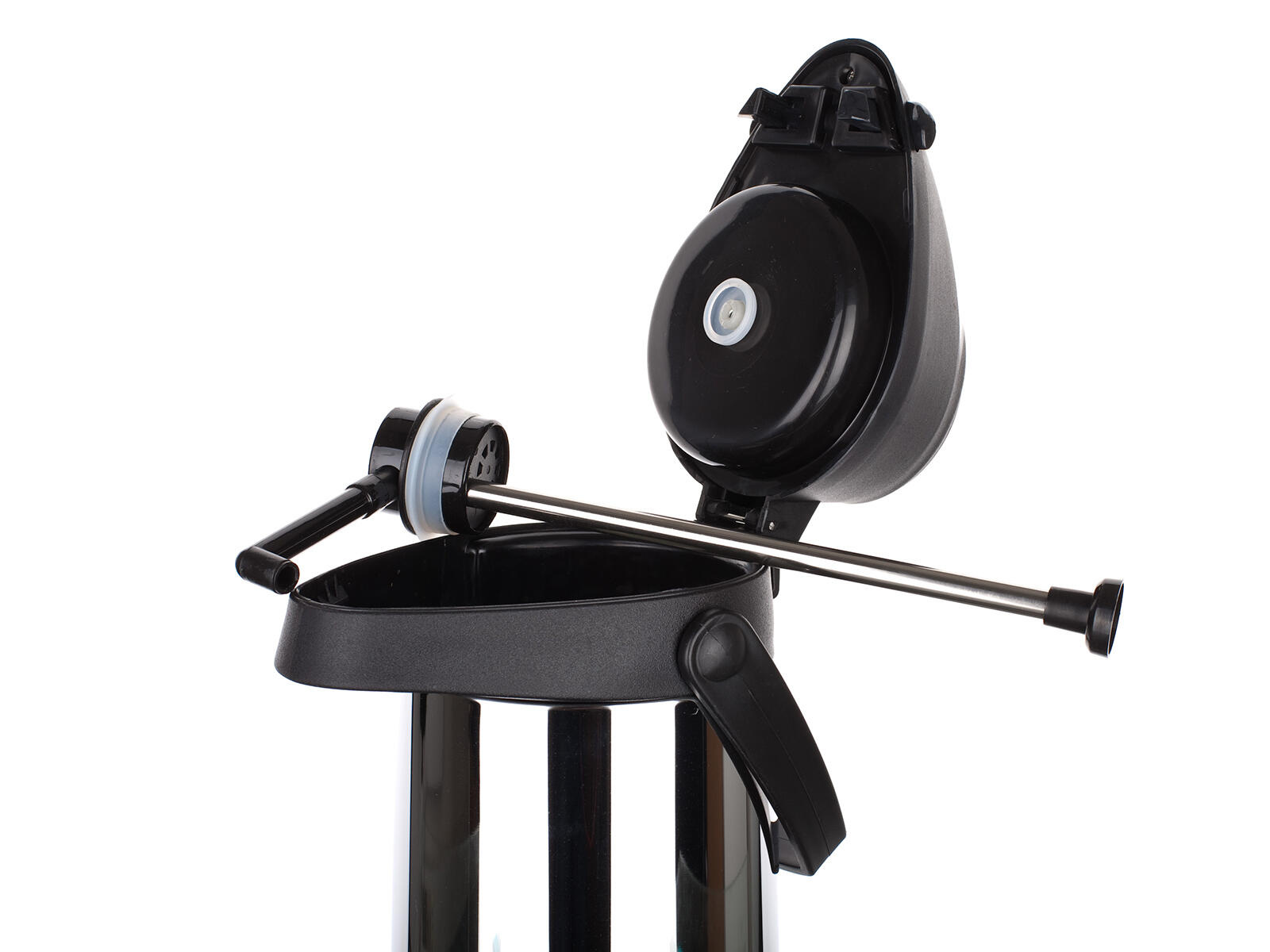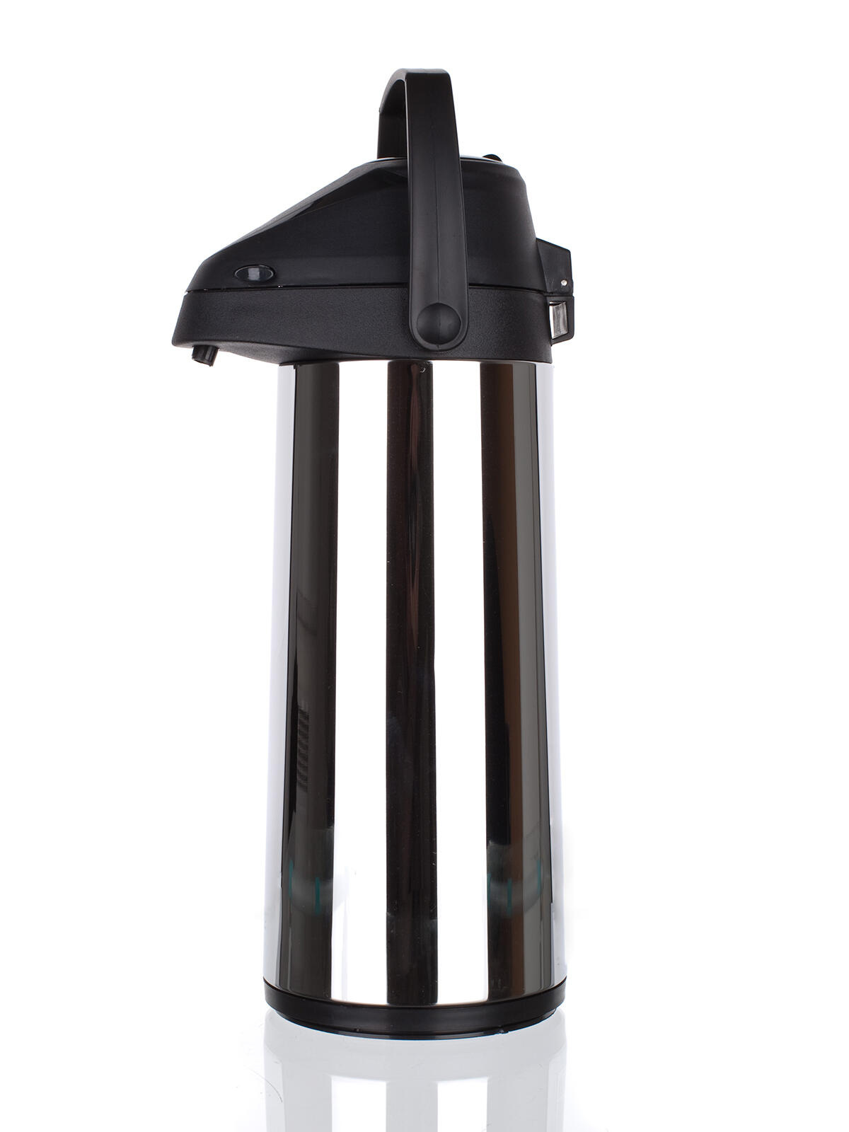 Nerezový plášť termosky má lesklou povrchovou úpravu, pumpa je vyrobena v kombinaci nerez / plast, víko, rukojeť a základna je z černého plastu, izolační vložka skleněná.
