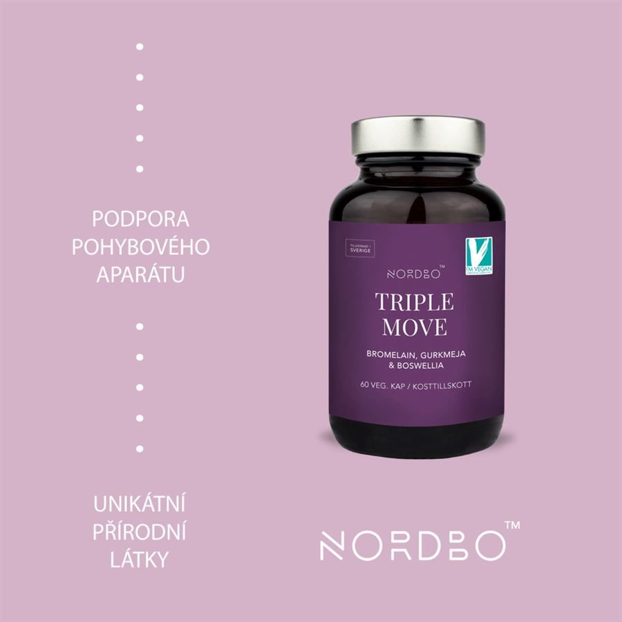 Nordbo Triple Move přináší další úroveň péče o pohybový aparát. Obsahuje komplex tří unikátních přírodních látek - kurkumu (z toho 95 % kurkuminu), boswelli (boswelia serrata P.E. 4:1) a bromelain (Ananas comosus 1200 GDU/g). Kurkuma a její hlavní účinná látka kurkumin mají stovky potvrzených účinků, boswellia neboli kadidlovník je extrémně účinná rostlina v oblasti oxidativního stresu a bromelain je enzym extrahovaný z ananasu, jehož vlastnosti souvisejí s regenerací. Tyto tři látky dohromady vytváří precizně cílenou a mimořádně silnou pomoc pro namáhaný pohybový aparát.