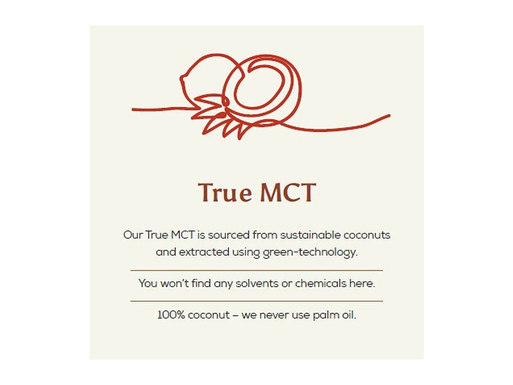 True MCT jsou prémiové, panensky čisté MCT tuky izolované z výběrových kokosových ořechů a to POUZE za využití 100% čisté vodní páry. To znamená bez použití jakýchkoliv jiných chemických rozpouštědel a extrakčních metod, které zanechávají stopová rezidua nežádoucích látek. Kokosy, které prochází náročnou selekcí, jsou pěstovány 100 % udržitelným způsobem v rámci ekologického pěstitelství. Díky tomu si uchovávají absolutní čistotu, unikátní vlastnosti a ohleduplnost k životnímu prostředí, na rozdíl od produktů z palmového oleje.