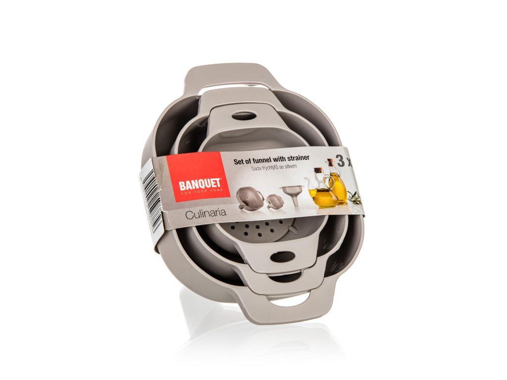 Sada plastových trychtýřu se sítkem CULINARIA slouží k pohodlnému nalévání tekutin do nádob s úzkými hrdly i jejich cezení díky sítku, které je možno vložit do každé velikosti.
