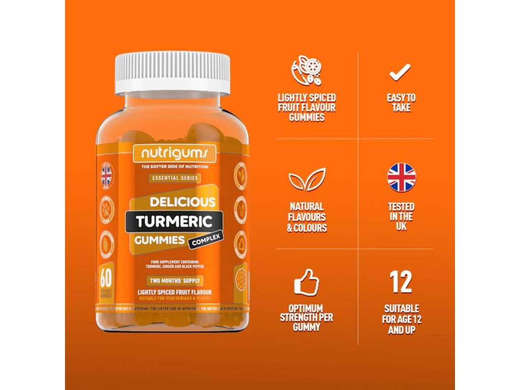 Vitamínová želé nemusí být plná umělých sladidel a barviv! Jde si pochutnat i bez syntetických látek. Želé Nutrigums® Turmeric Complex mají lahodnou přírodní broskvovou příchuť a lehce se konzumují. Tělu dodávají extrakt z kurkumy (účinné látky kurkuminoidy), extrakt ze zázvoru (účinné látky gingeroly) a extrakt z černého pepře (účinná látka piperin). Kurkuma a zázvor mají vlastnosti související s oxidativním stresem, pomáhají harmonizovat organismus při velké zátěži a posilují obranný štít. Černý pepř zlepšuje jejich vstřebání do organismu.
