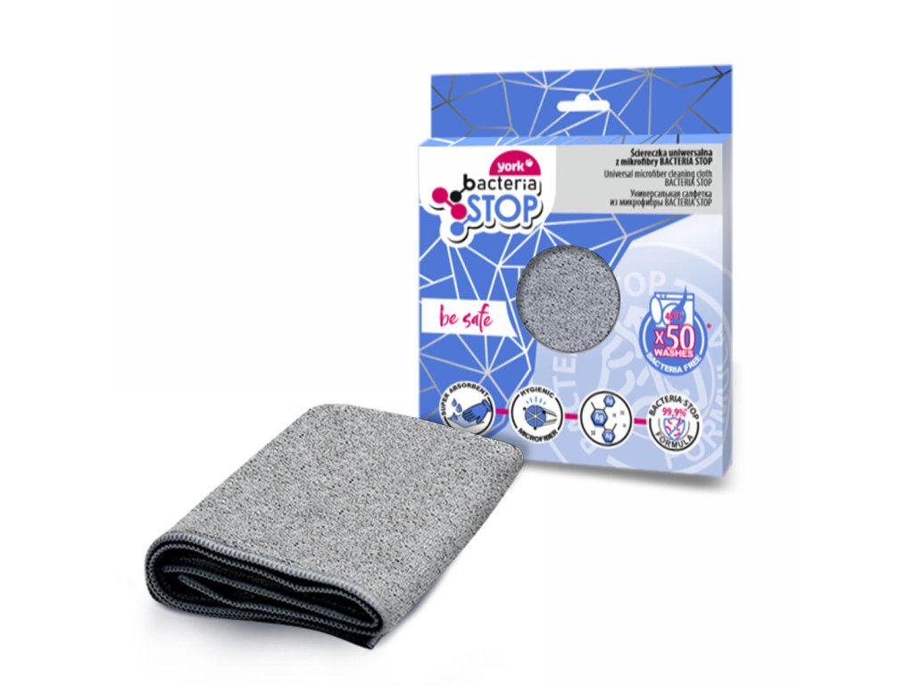 Utěrka BACTERIA STOP z mikrovlákna, obsahující ionty stříbra, které zabraňují růstu bakterií na povrchu látky.