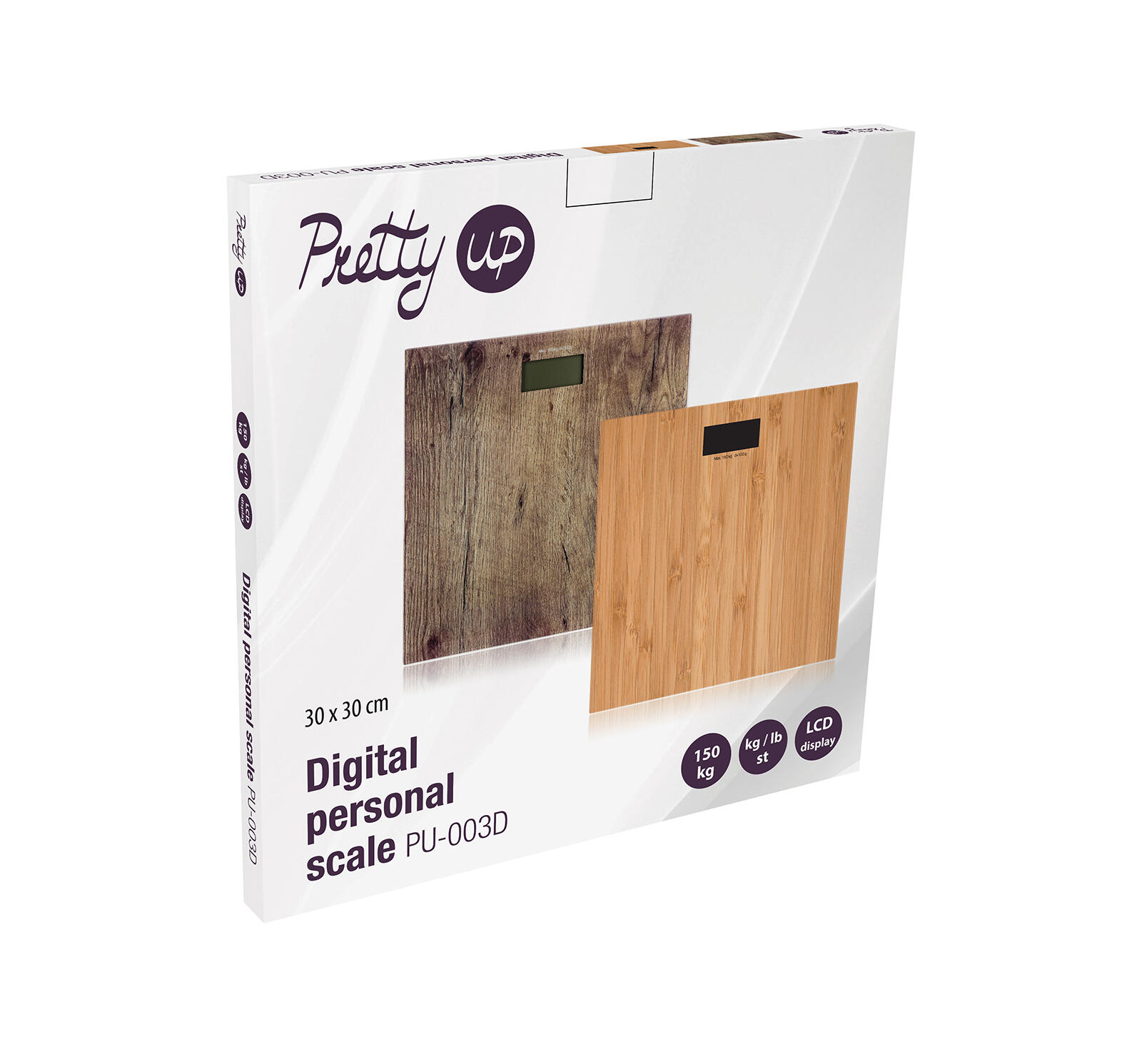 Osobní digitální váha PU-005WN, v dekoru dřeva, s možností vážení v kg a lb.
