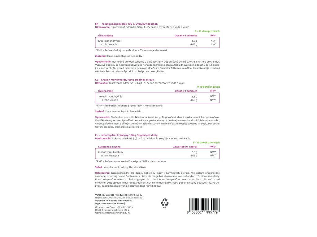 Náš kreatin monohydrát si můžete vybrat ze tří velikostí balení podle svých potřeb: 100 g, 250 g a 500 g.