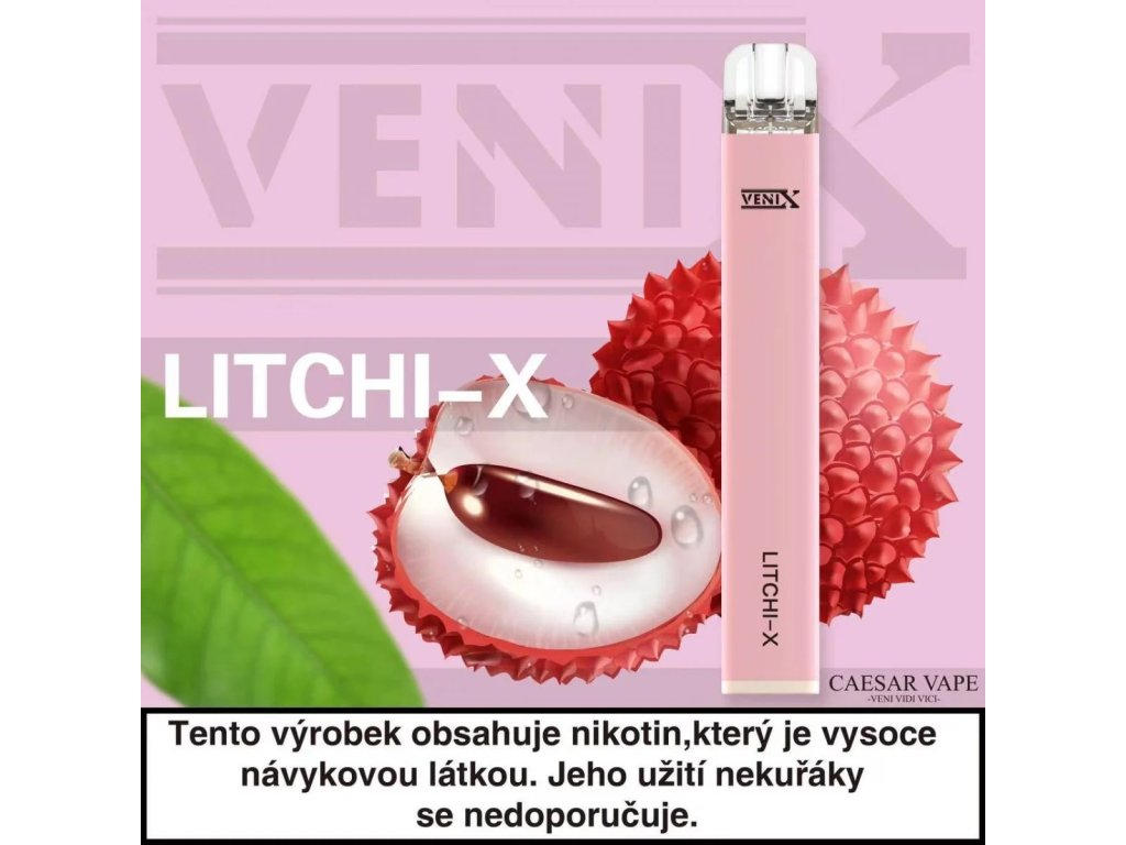 Jednorázová elektronická cigareta VeniX s příchutí liči - Litchi. Až 700 potahů a příjemnou chutí. Užijte si perfektní vaping s naši elektronickou cigaretou VeniX.  Obsah nikotinu pouze 1,62% !