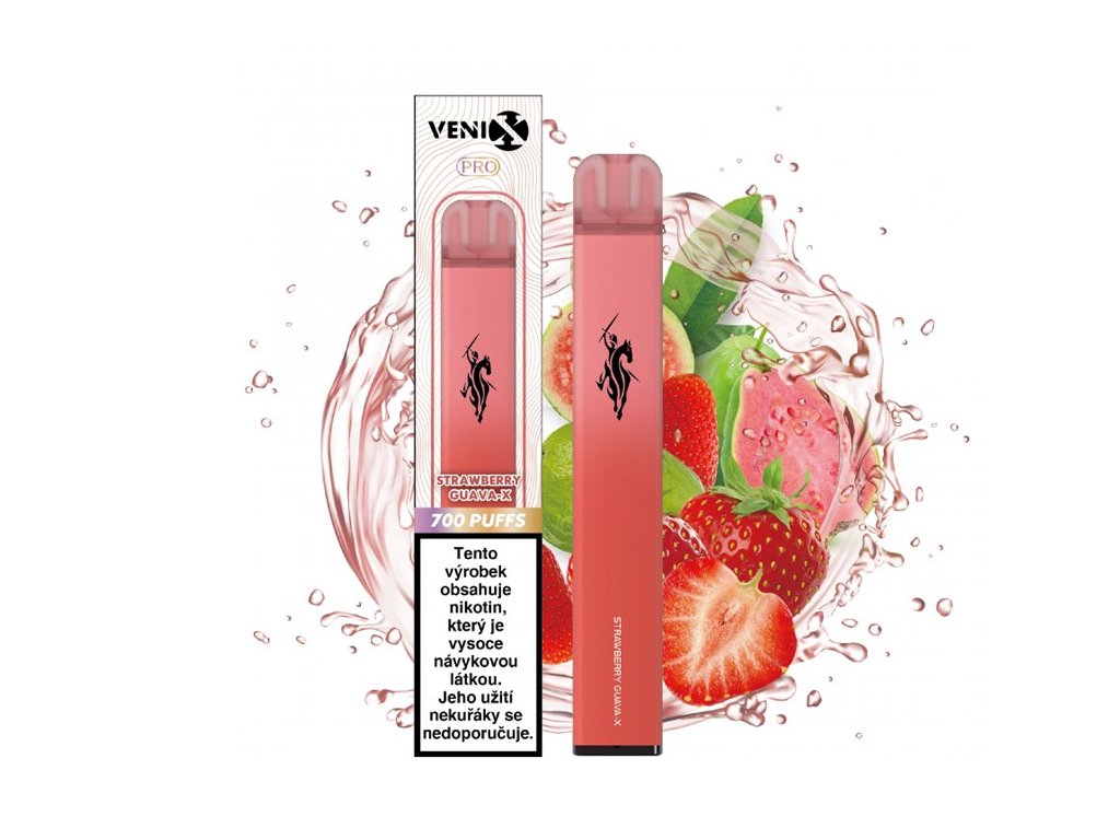 VENIX PRO - STRAWBERRY GUAVA-X Vítejte ve světě osvěžujícího dobrodružství s novou příchutí VENIX PRO - Strawberry Guava! Sladké ovocné tóny zralých jahod sloučené s exotickou svěžestí guavy, která rozproudí vaše smysly jako vítr tropického ráje. Jednorázová elektronická cigareta VENIX PRO s příchutí jahod a guave - STRAWBERRY GUAVA. Až 700 potahů a příjemnou chutí. Užijte si perfektní vaping s naši elektronickou cigaretou VENIX.  Obsah nikotinu pouze 1,62% !